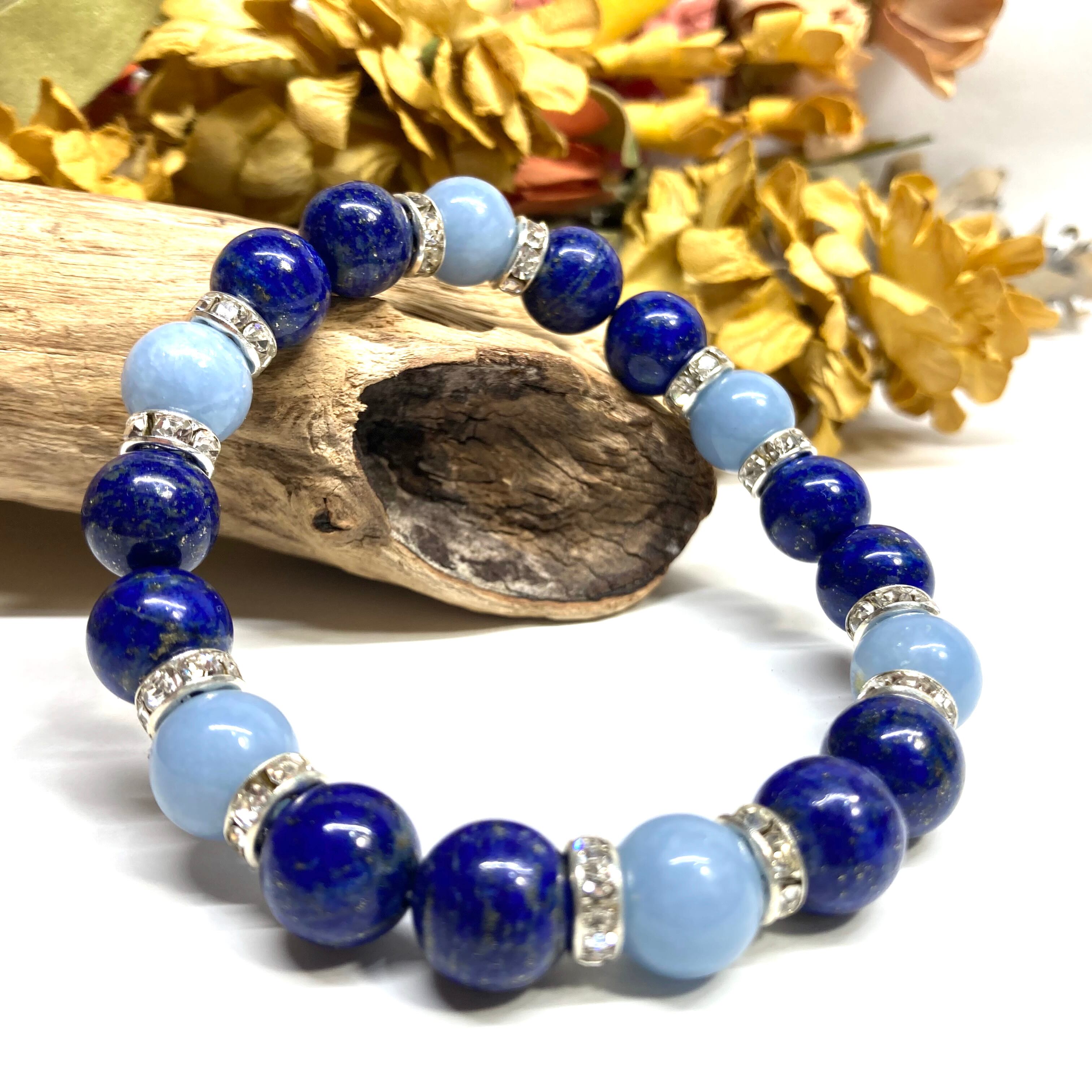 こちらは、ラピスラズリとエンジェライトを組み合わせたパワーストーンブレスレットです。間にはロンデルを挟み高級感あるデザインに仕上げております。石大きさは腕にも馴染みやすいように10mm玉で内径約18cm(伸可能)です。 数に限りがございますので気になる方はお早めにどうぞ。