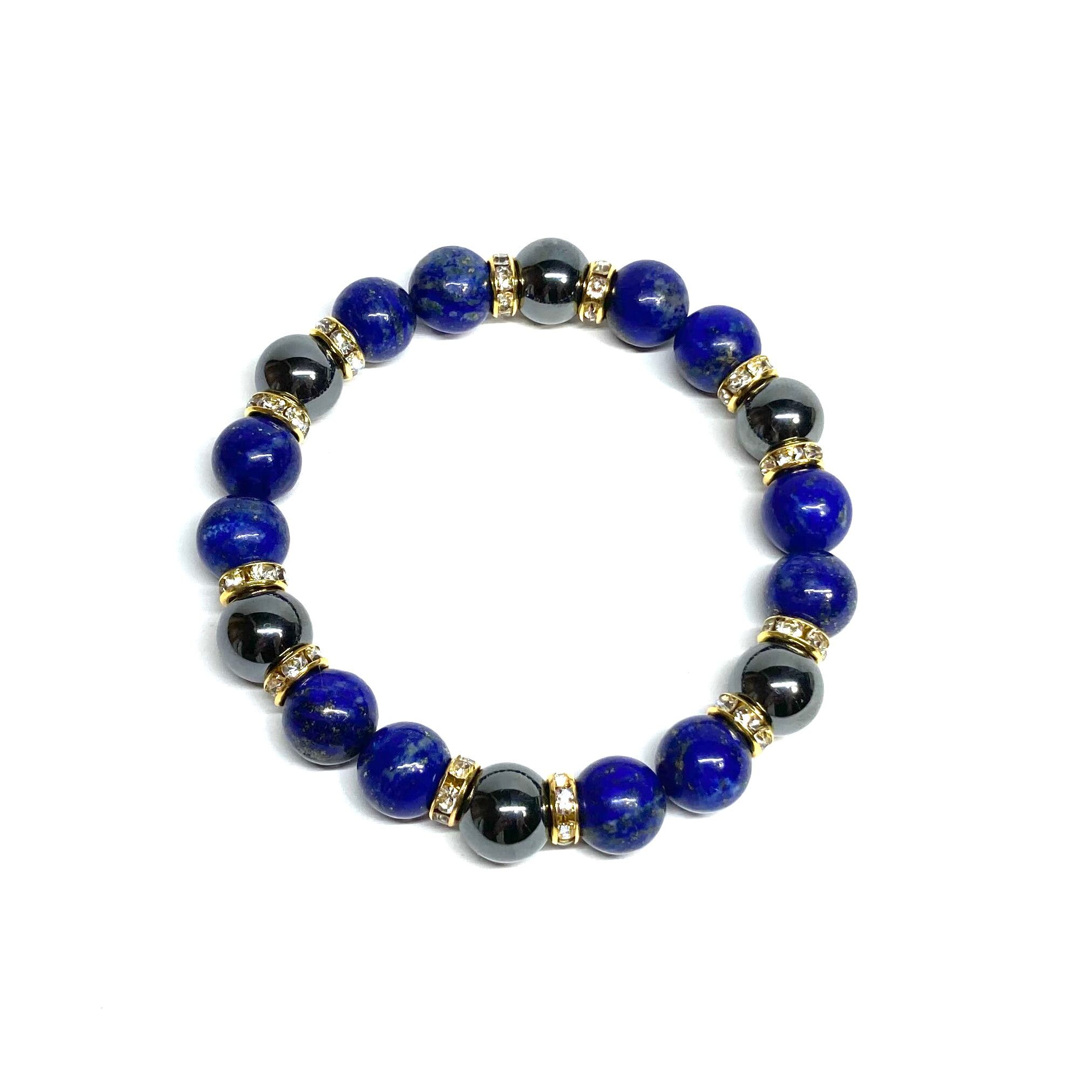 こちらは、ラピスラズリとヘマタイトを組み合わせたパワーストーンブレスレットです。間にはロンデルを挟み高級感あるデザインに仕上げております。石大きさは腕にも馴染みやすいように10mm玉で内径約18cm(伸可能)です。 数に限りがございますので気になる方はお早めにどうぞ。