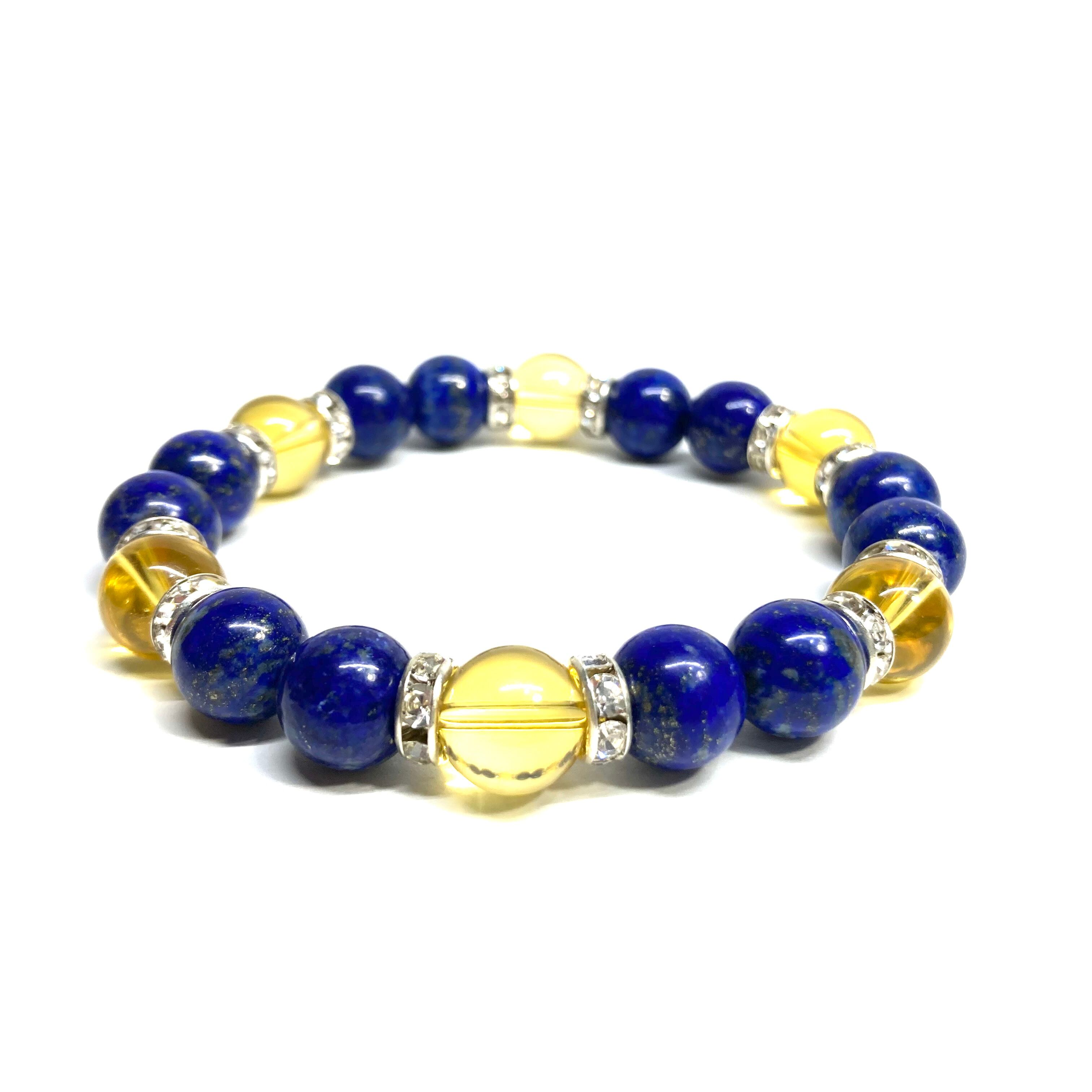 こちらは、ラピスラズリとシトリンを組み合わせたパワーストーンブレスレットです。間にはロンデルを挟み高級感あるデザインに仕上げております。石大きさは腕にも馴染みやすいように10mm玉で内径約18cm(伸可能)です。 数に限りがございますので気になる方はお早めにどうぞ。