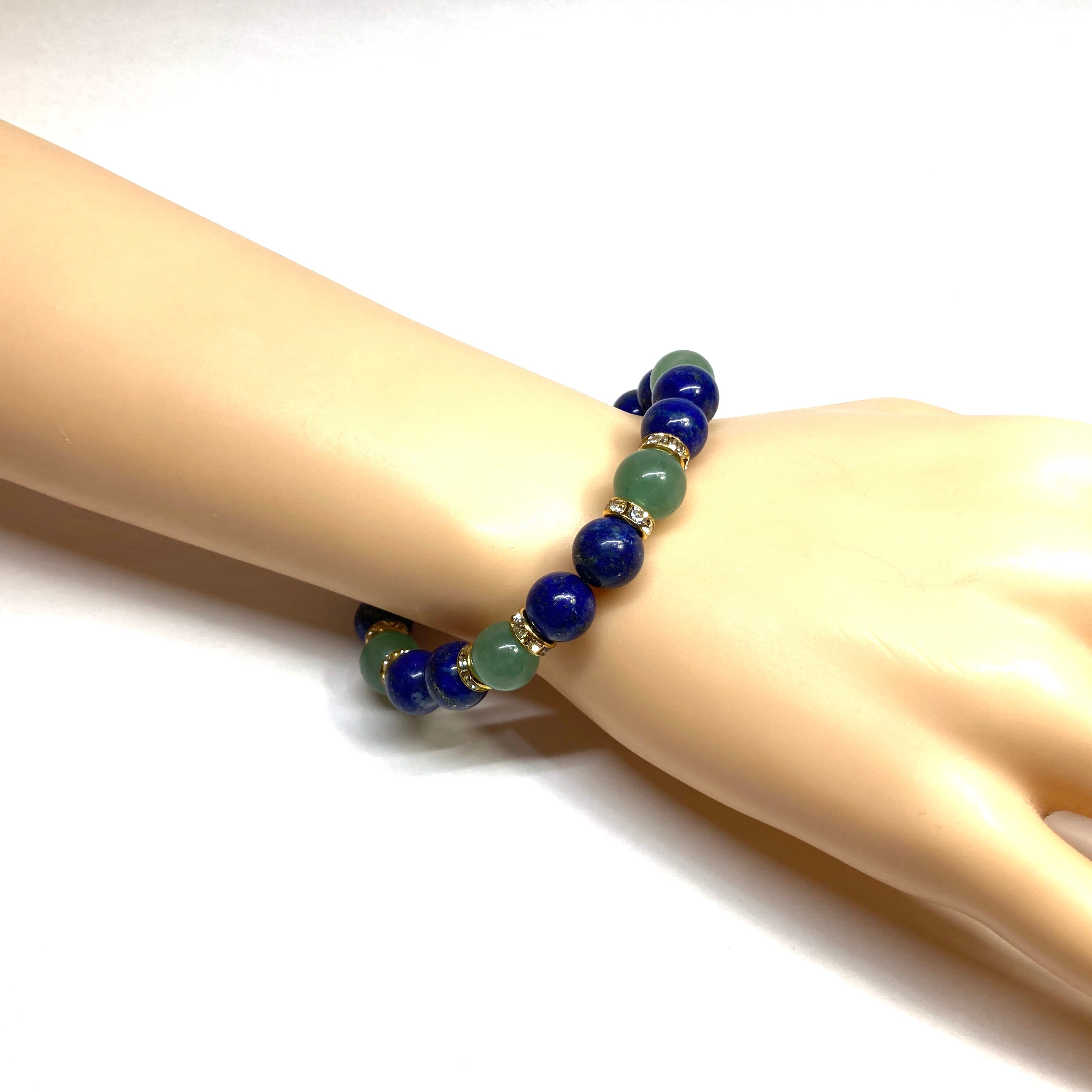 こちらは、ラピスラズリとアベンチュリンを組み合わせたパワーストーンブレスレットです。間にはロンデルを挟み高級感あるデザインに仕上げております。石大きさは腕にも馴染みやすいように10mm玉で内径約18cm(伸可能)です。 数に限りがございますので気になる方はお早めにどうぞ。