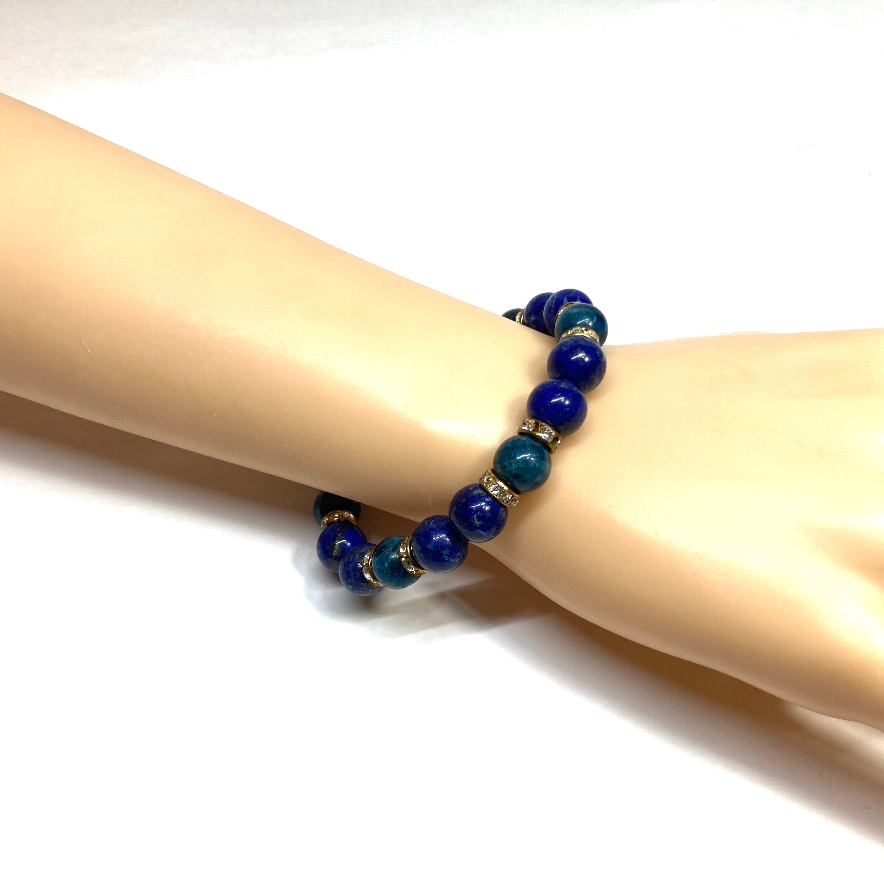 こちらは、ラピスラズリとアパタイトを組み合わせたパワーストーンブレスレットです。間にはロンデルを挟み高級感あるデザインに仕上げております。石大きさは腕にも馴染みやすいように10mm玉で内径約18cm(伸可能)です。 数に限りがございますので気になる方はお早めにどうぞ。