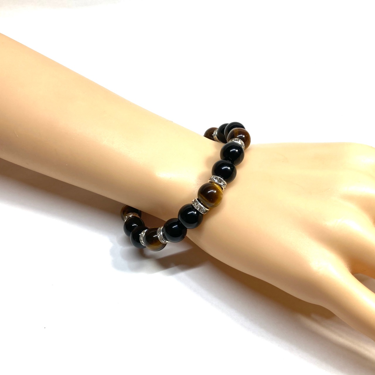 こちらは、モリオンとタイガーアイを組み合わせたパワーストーンブレスレットです。間にはロンデルを挟み高級感あるデザインに仕上げております。石大きさは腕にも馴染みやすいように10mm玉で内周 約18cm(伸可能)です。 数に限りがございますので気になる方はお早めにどうぞ。