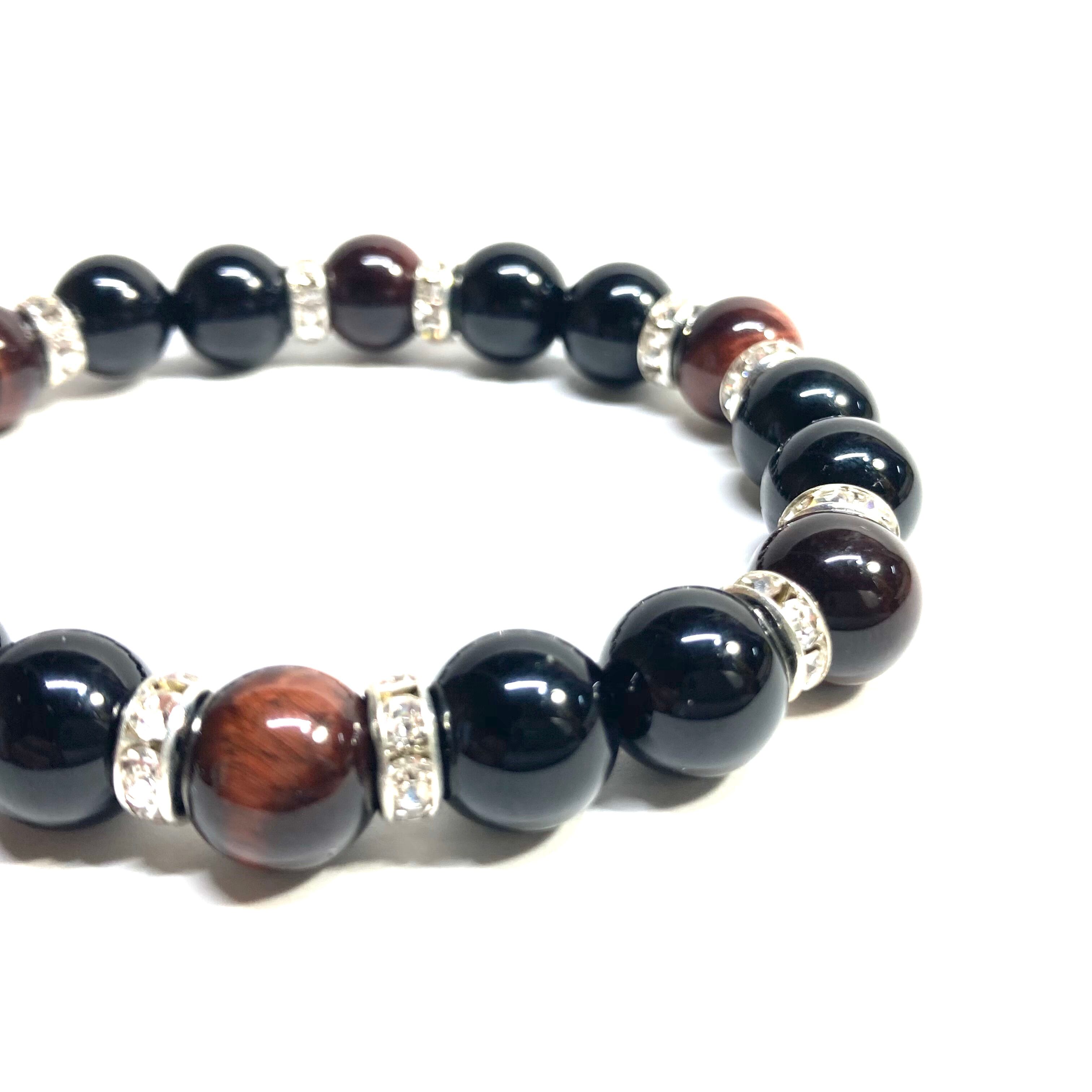 こちらは、モリオンとレッドタイガーアイを組み合わせたパワーストーンブレスレットです。間にはロンデルを挟み高級感あるデザインに仕上げております。石大きさは腕にも馴染みやすいように10mm玉で内径約18cm(伸可能)です。 数に限りがございますので気になる方はお早めにどうぞ。