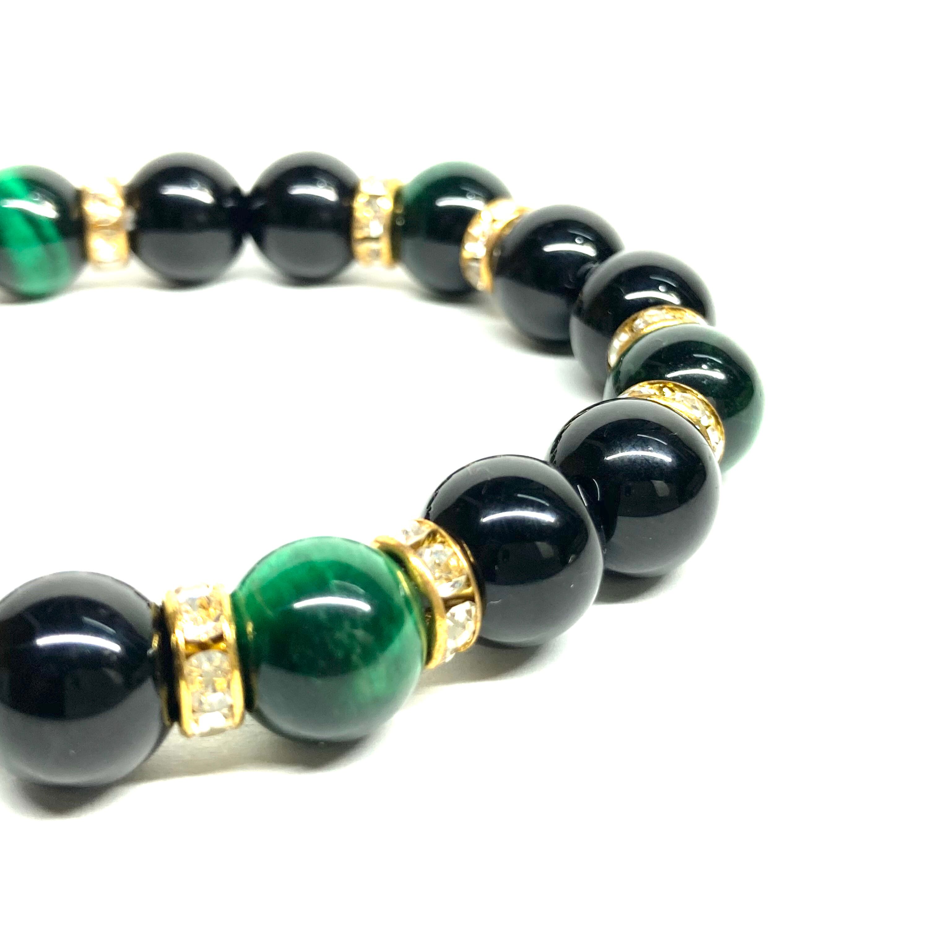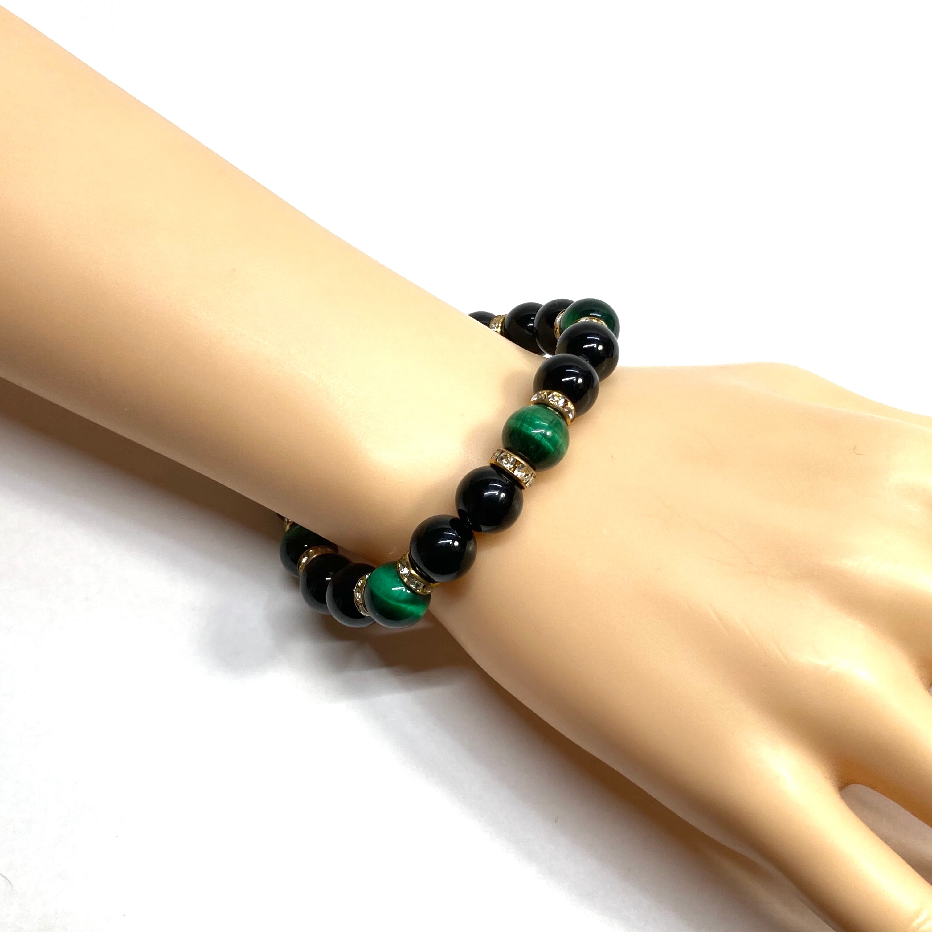 こちらは、モリオンとグリーンタイガーアイを組み合わせたパワーストーンブレスレットです。間にはロンデルを挟み高級感あるデザインに仕上げております。石大きさは腕にも馴染みやすいように10mm玉で内径約18cm(伸可能)です。 数に限りがございますので気になる方はお早めにどうぞ。