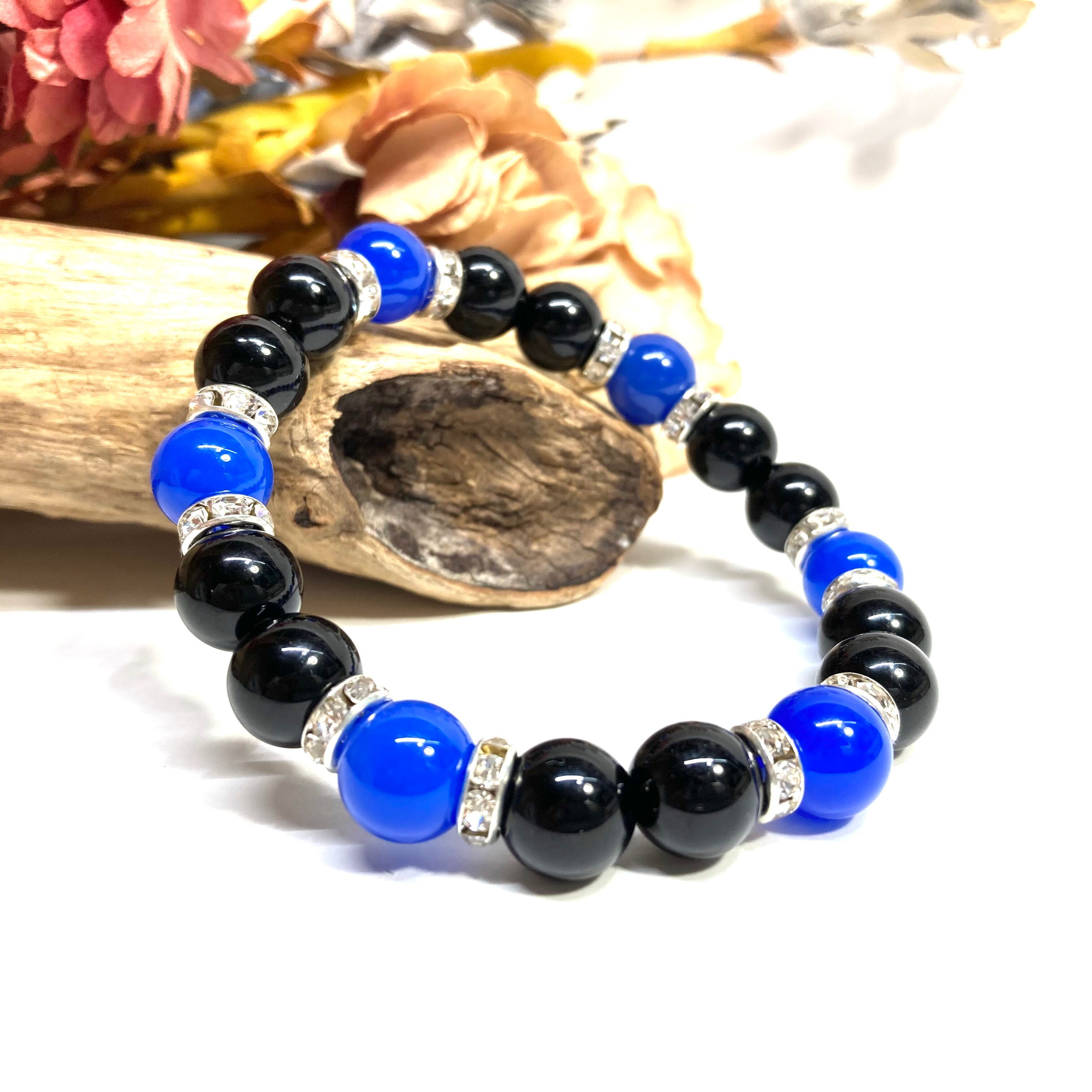 こちらは、モリオンと青瑪瑙を組み合わせたパワーストーンブレスレットです。間にはロンデルを挟み高級感あるデザインに仕上げております。石大きさは腕にも馴染みやすいように10mm玉で内径約18cm(伸可能)です。 数に限りがございますので気になる方はお早めにどうぞ。