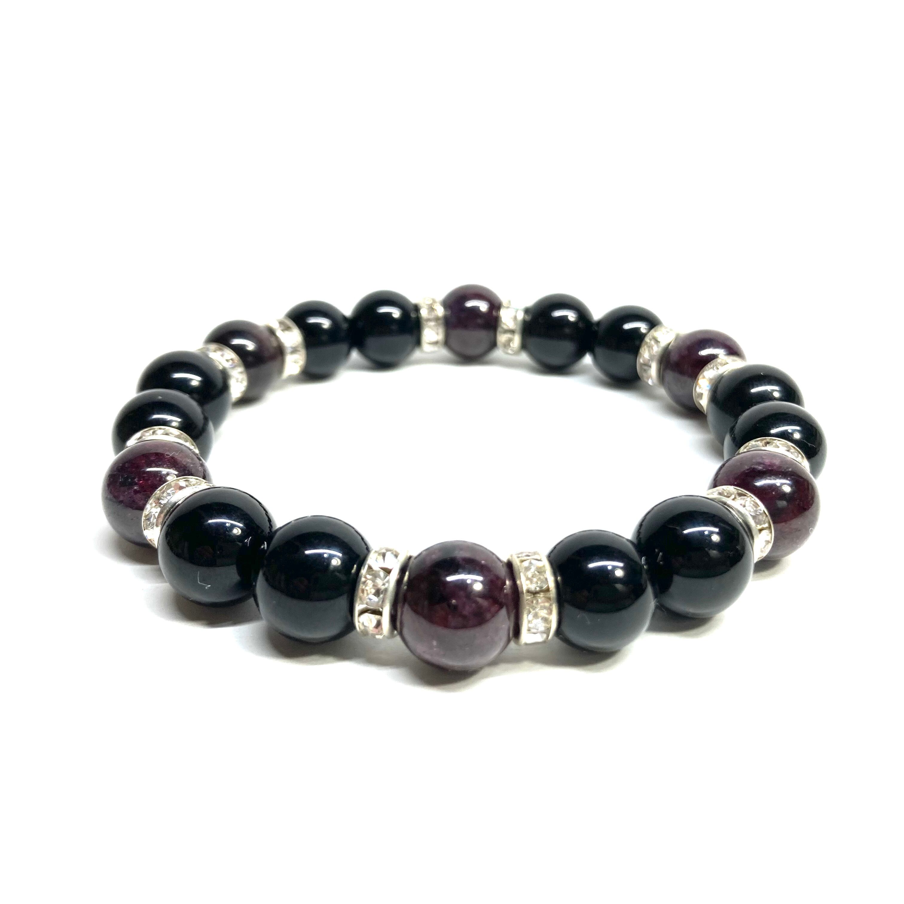 こちらは、モリオンとガーネットを組み合わせたパワーストーンブレスレットです。間にはロンデルを挟み高級感あるデザインに仕上げております。石大きさは腕にも馴染みやすいように10mm玉で内径約18cm(伸可能)です。 数に限りがございますので気になる方はお早めにどうぞ。