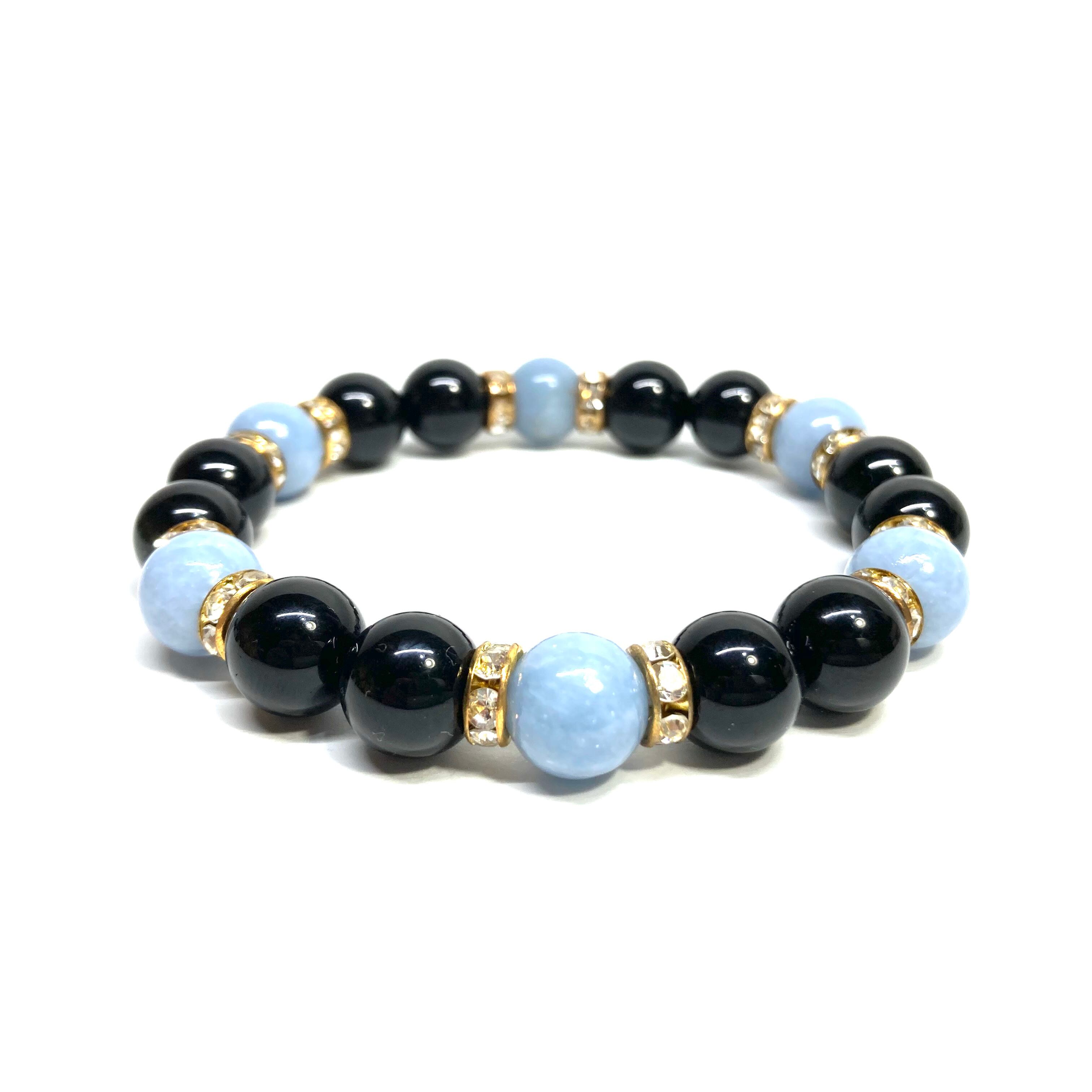 こちらは、モリオンとエンジェライトを組み合わせたパワーストーンブレスレットです。間にはロンデルを挟み高級感あるデザインに仕上げております。石大きさは腕にも馴染みやすいように10mm玉で内径約18cm(伸可能)です。 数に限りがございますので気になる方はお早めにどうぞ。