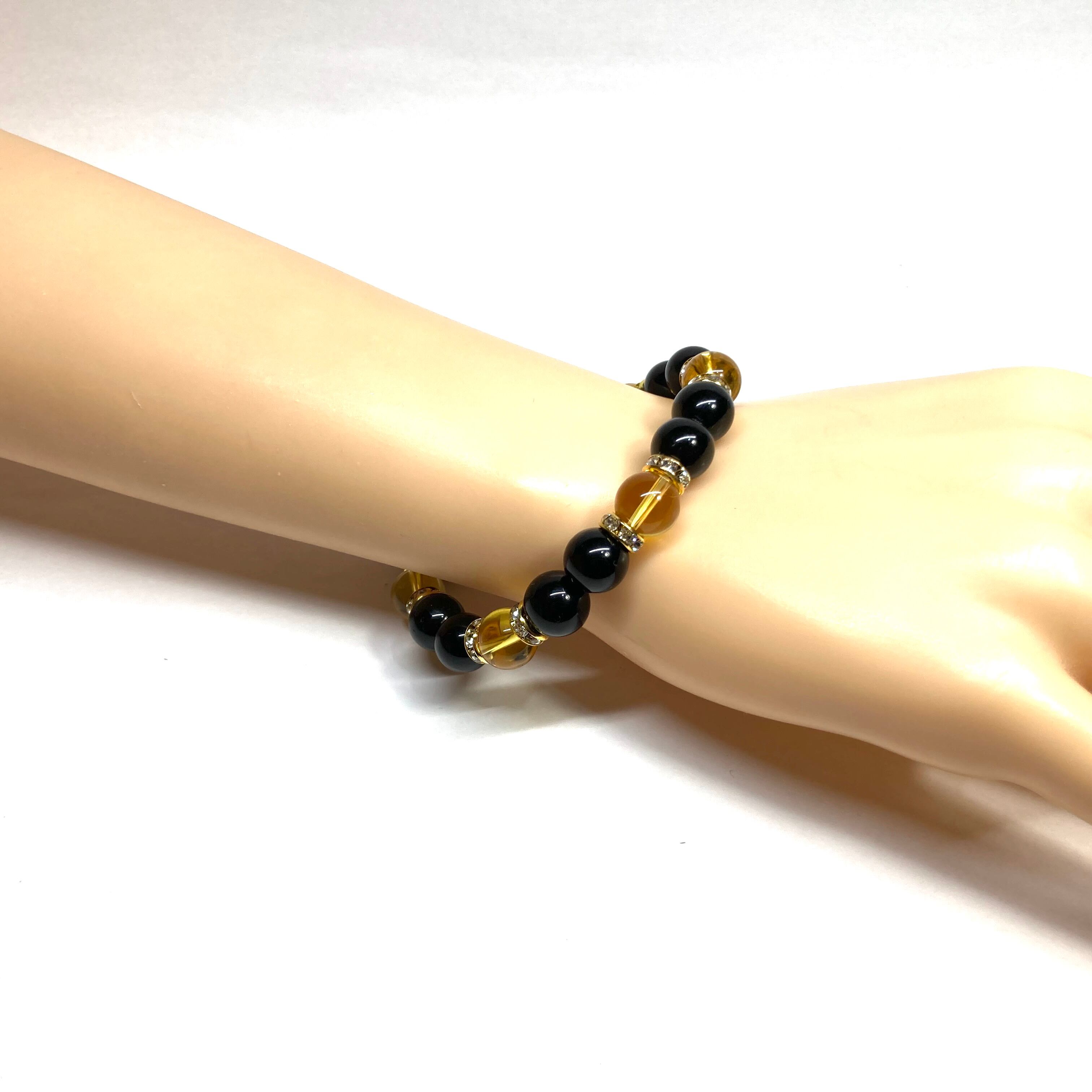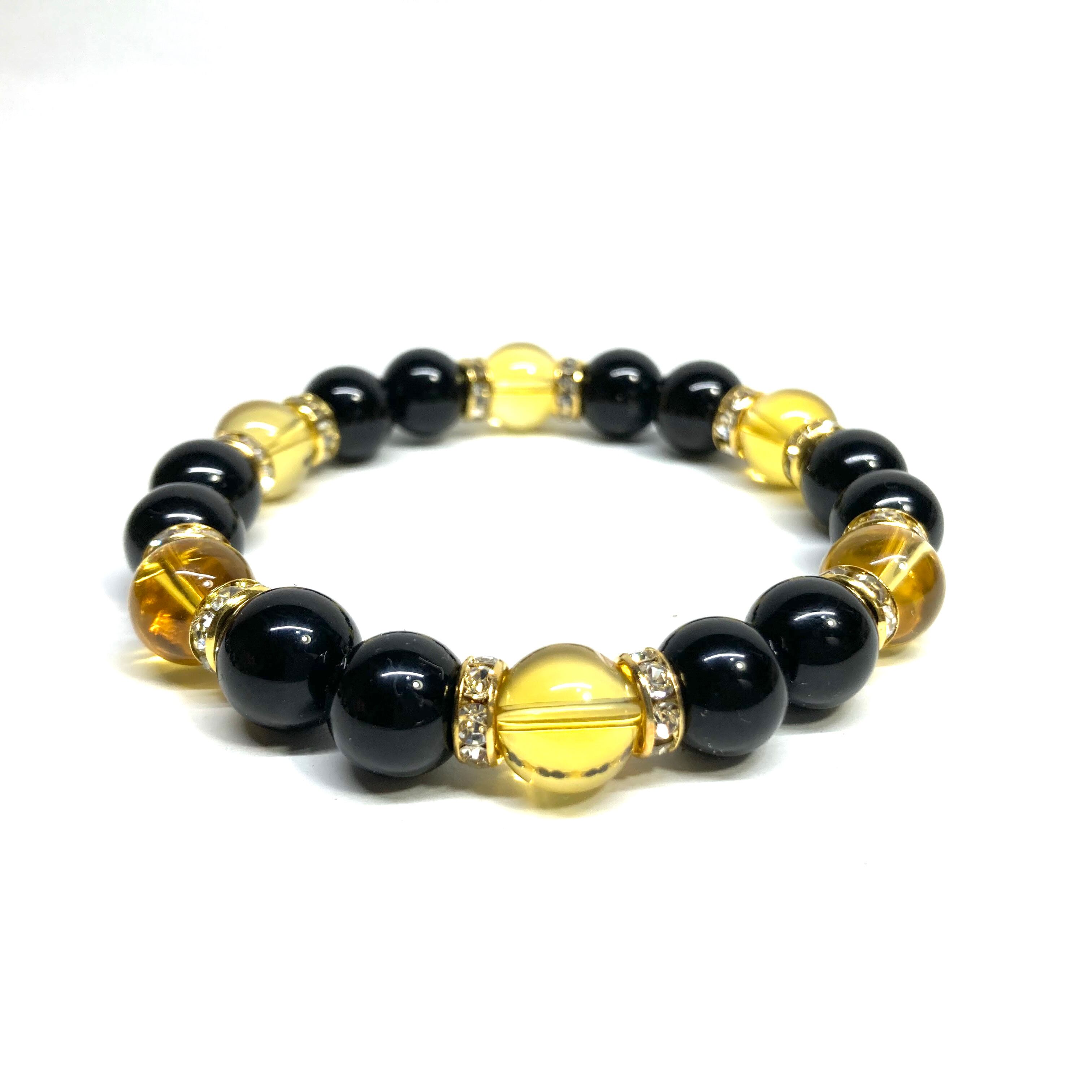 こちらは、モリオンとシトリンを組み合わせたパワーストーンブレスレットです。間にはロンデルを挟み高級感あるデザインに仕上げております。石大きさは腕にも馴染みやすいように10mm玉で内径約18cm(伸可能)です。 数に限りがございますので気になる方はお早めにどうぞ。