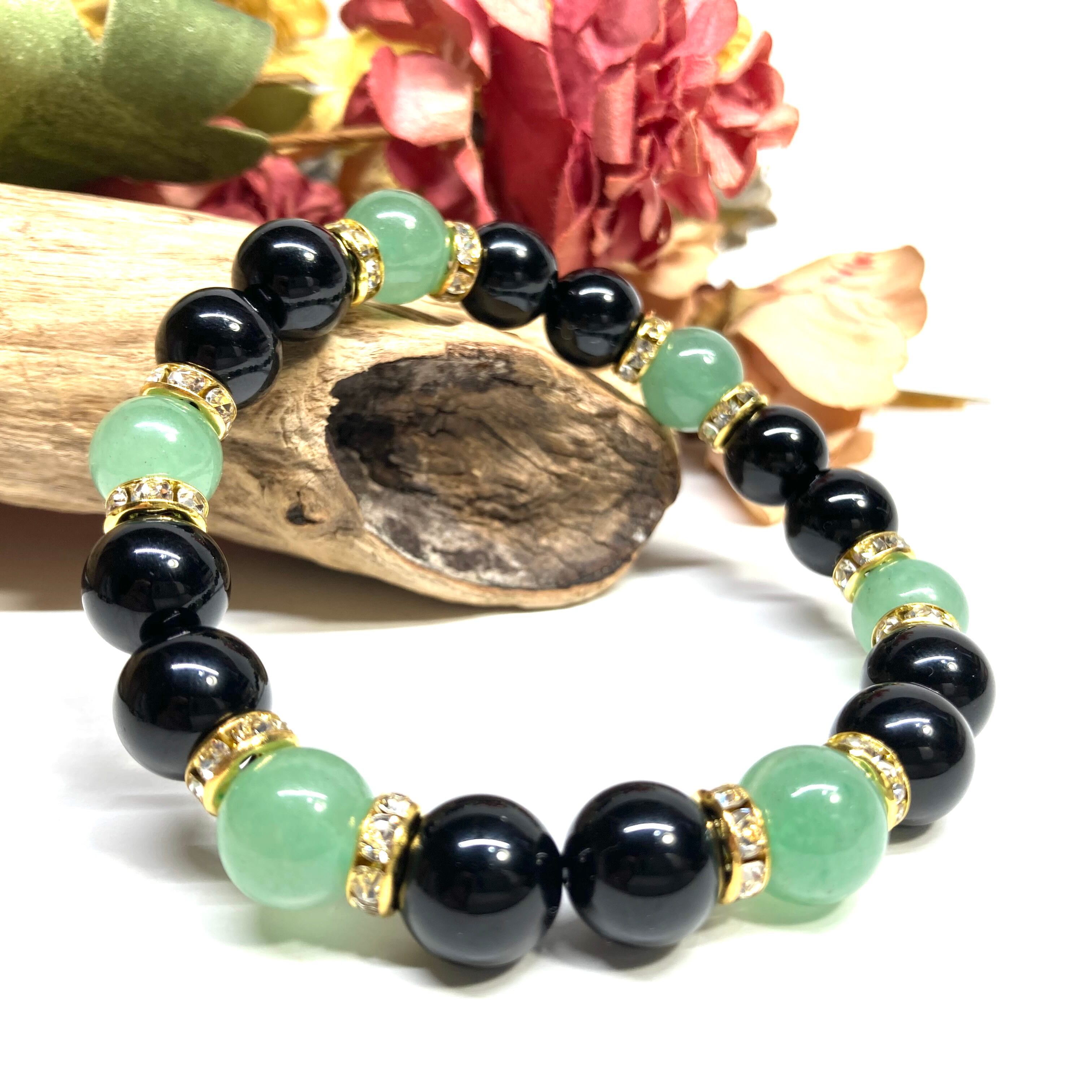 こちらは、モリオンとアベンチュリンを組み合わせたパワーストーンブレスレットです。間にはロンデルを挟み高級感あるデザインに仕上げております。石大きさは腕にも馴染みやすいように10mm玉で内径約18cm(伸可能)です。 数に限りがございますので気になる方はお早めにどうぞ。