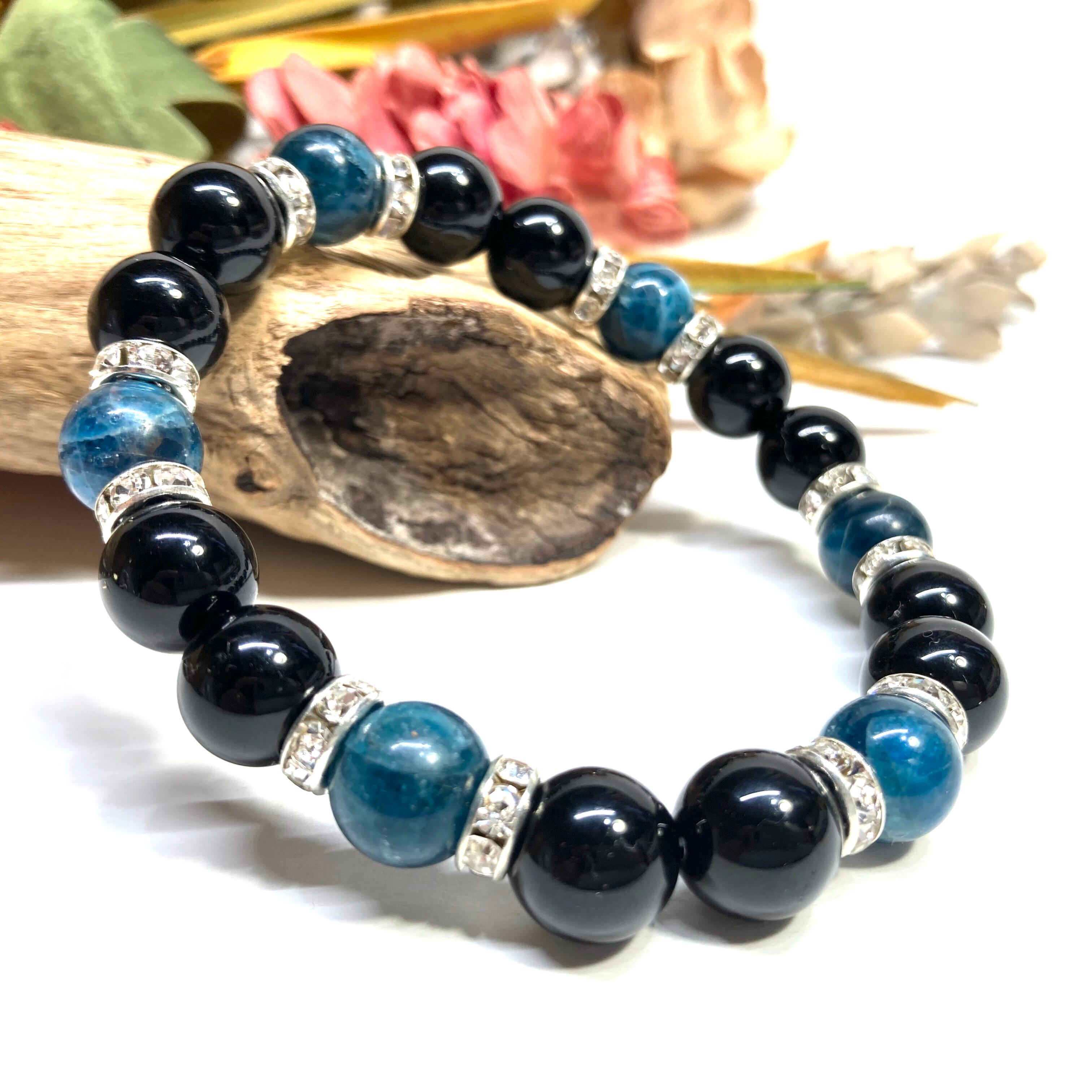 こちらは、モリオンとアパタイトを組み合わせたパワーストーンブレスレットです。間にはロンデルを挟み高級感あるデザインに仕上げております。石大きさは腕にも馴染みやすいように10mm玉で内径約18cm(伸可能)です。 数に限りがございますので気になる方はお早めにどうぞ。