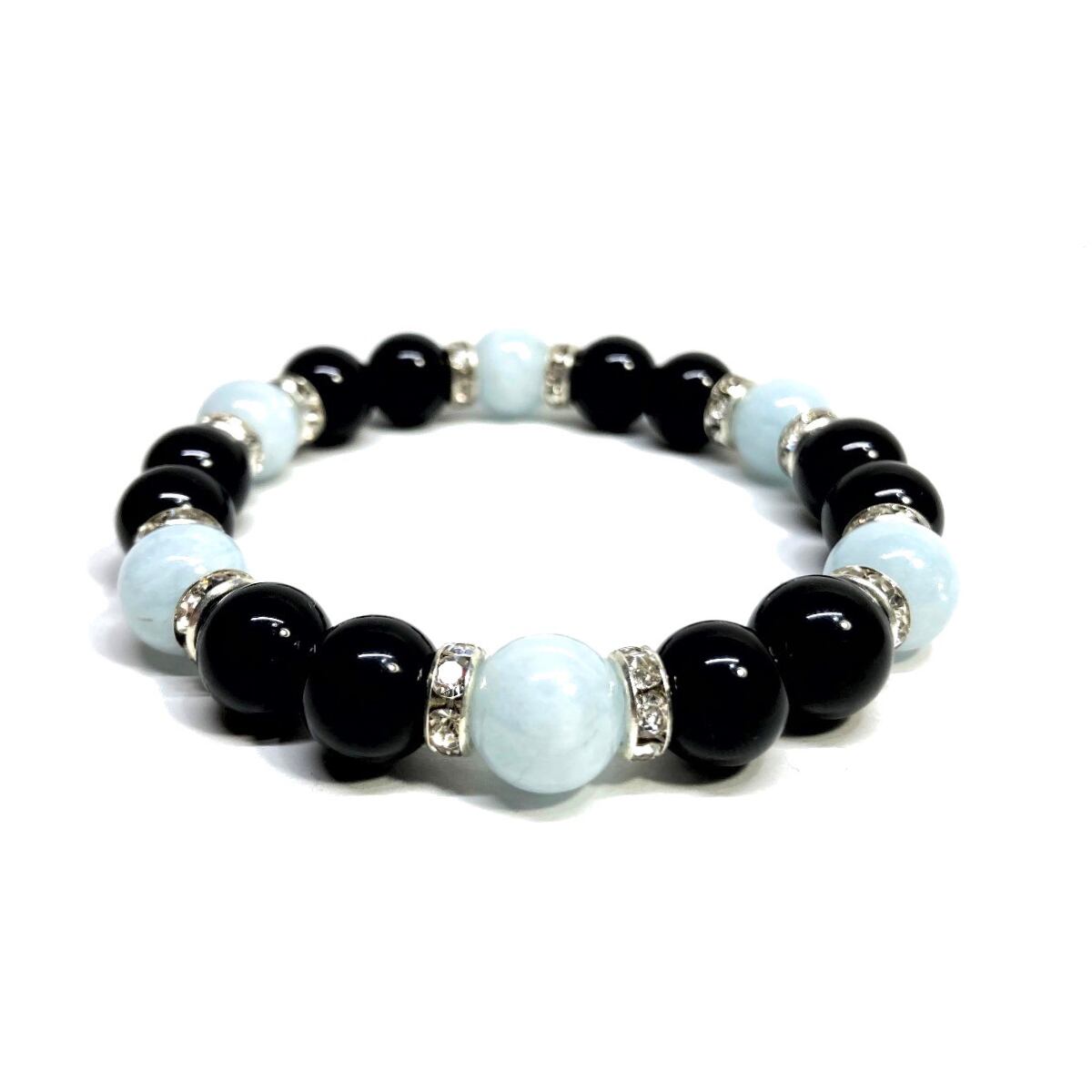 こちらは、モリオンとアクアマリンを組み合わせたパワーストーンブレスレットです。間にはロンデルを挟み高級感あるデザインに仕上げております。石大きさは腕にも馴染みやすいように10mm玉で内径約18cm(伸可能)です。 数に限りがございますので気になる方はお早めにどうぞ。