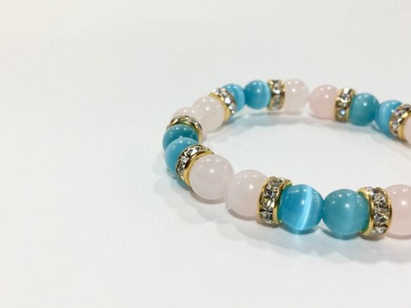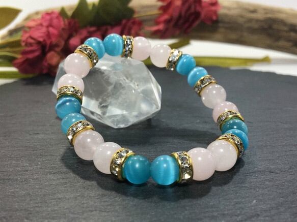 こちらは、8mm玉のライトブルーキャッツアイとローズクォーツを使用したパワーストーンブレスレットです。間にはロンデルを挟み高級感ある大人っぽいデザインに仕上がっています。サイズは内周約15cmです。気になる方は是非この機会にどうぞ。