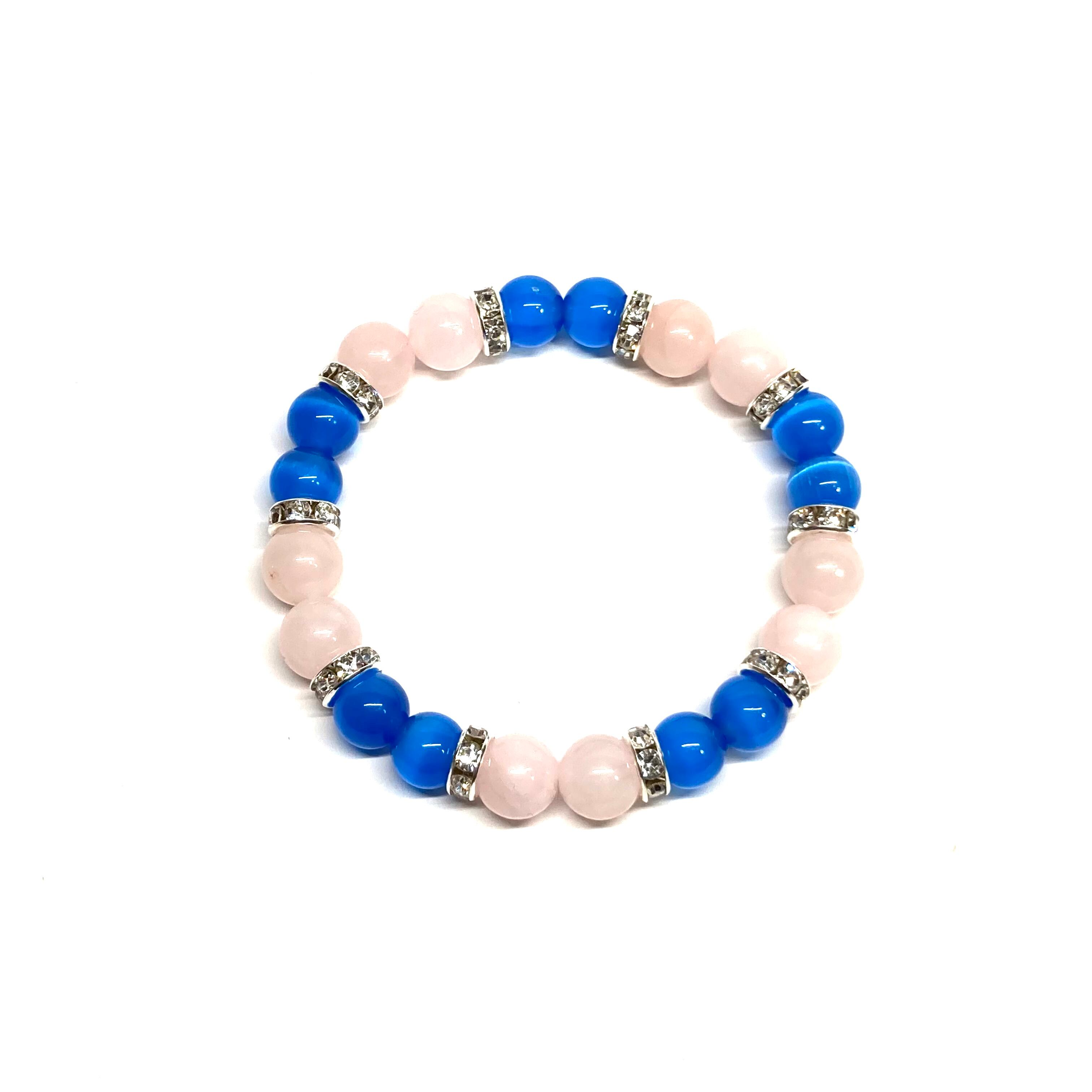 こちらは、8mm玉のブルーキャッツアイとローズクォーツを使用したパワーストーンブレスレットです。間にはシルバーのロンデルを挟み高級感ある大人っぽいデザインに仕上がっています。サイズは内周約15cmです。気になる方は是非この機会にどうぞ。