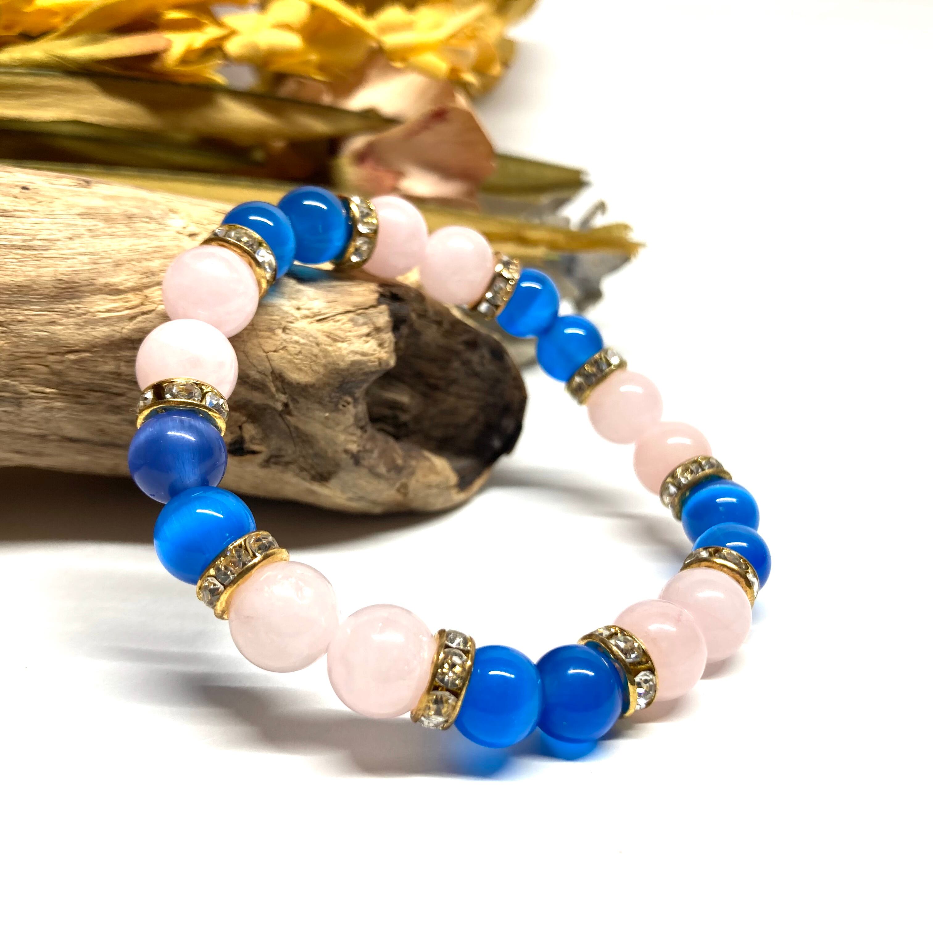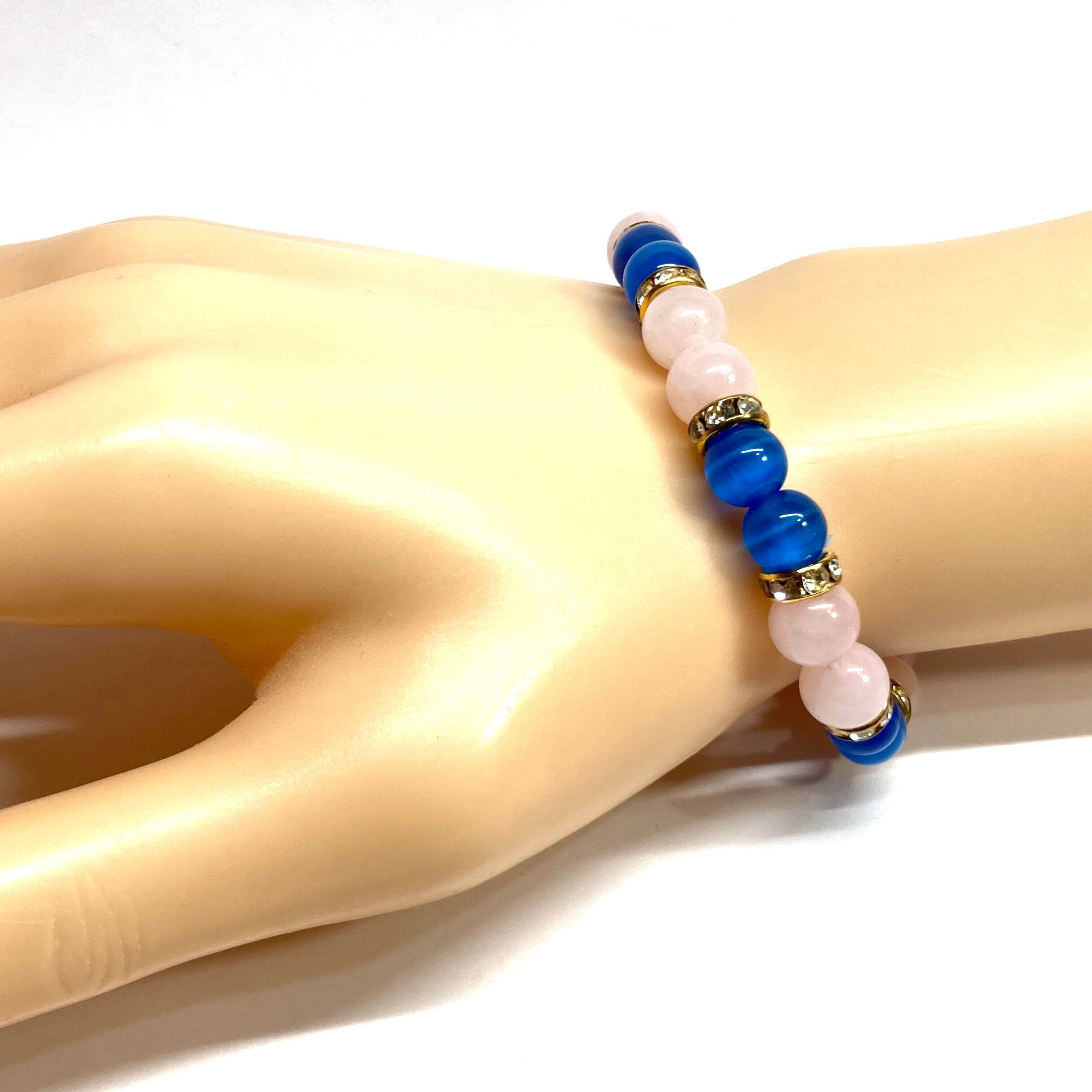 こちらは、8mm玉のブルーキャッツアイとローズクォーツを使用したパワーストーンブレスレットです。間にはゴールドのロンデルを挟み高級感ある大人っぽいデザインに仕上がっています。サイズは内周約15cmです。気になる方は是非この機会にどうぞ。