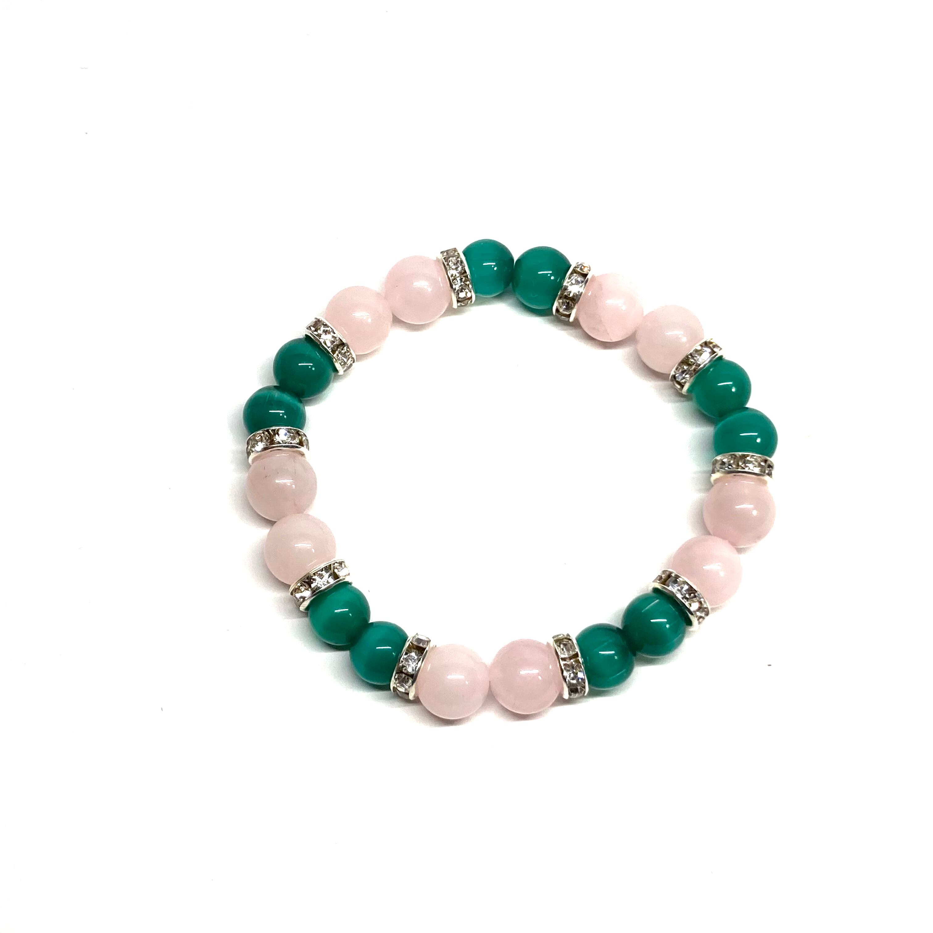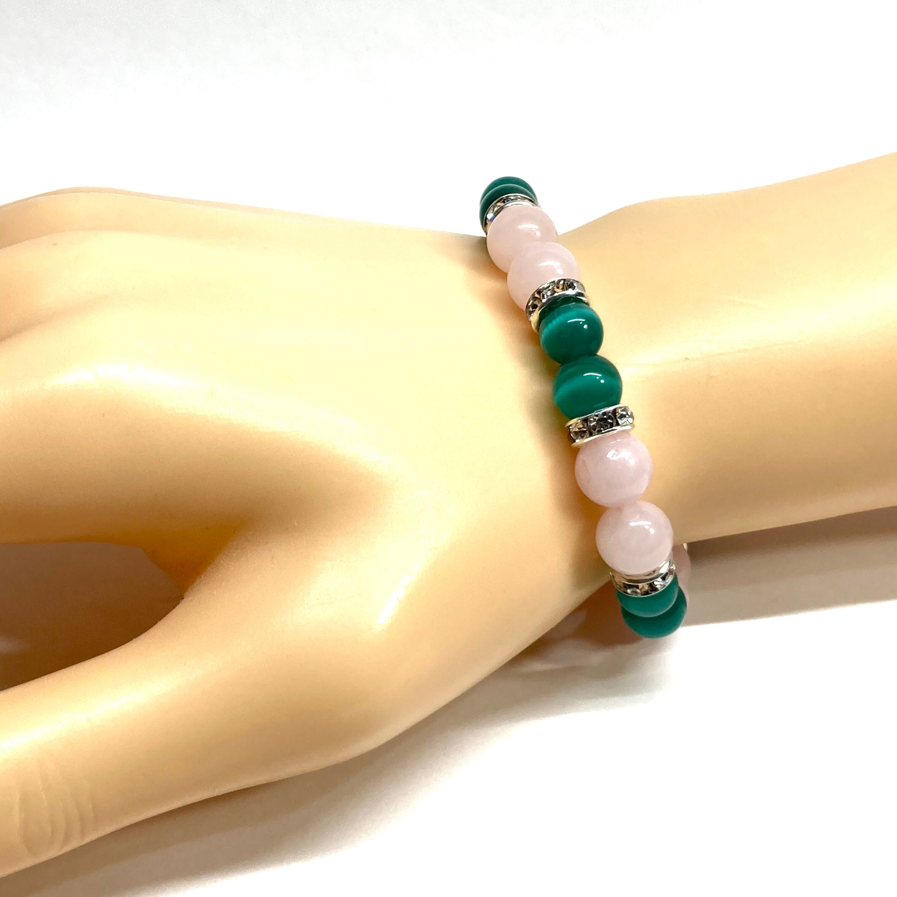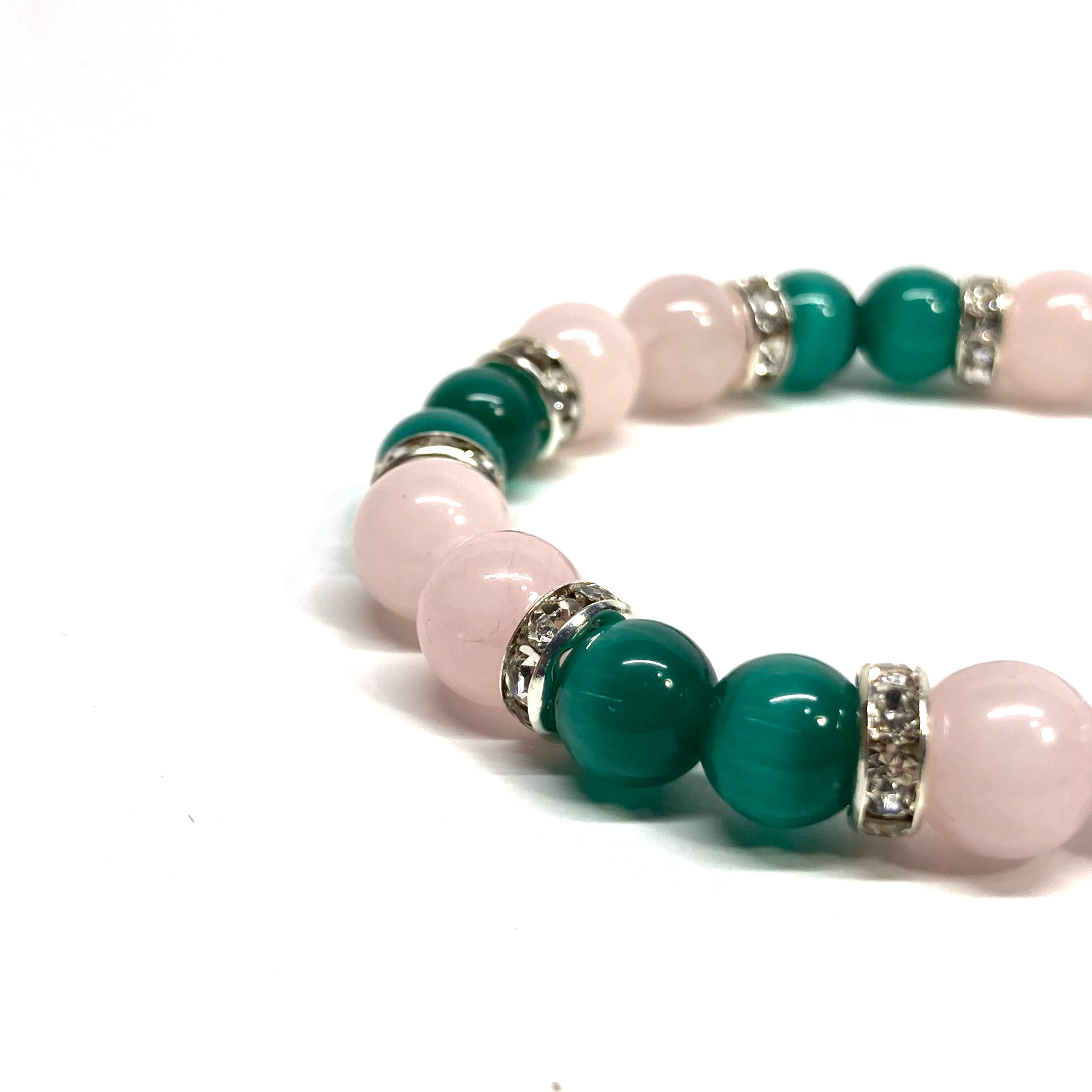こちらは、8mm玉のグリーンキャッツアイとローズクォーツを使用したパワーストーンブレスレットです。間にはシルバーのロンデルを挟み高級感ある大人っぽいデザインに仕上がっています。サイズは内周約15cmです。気になる方は是非この機会にどうぞ。