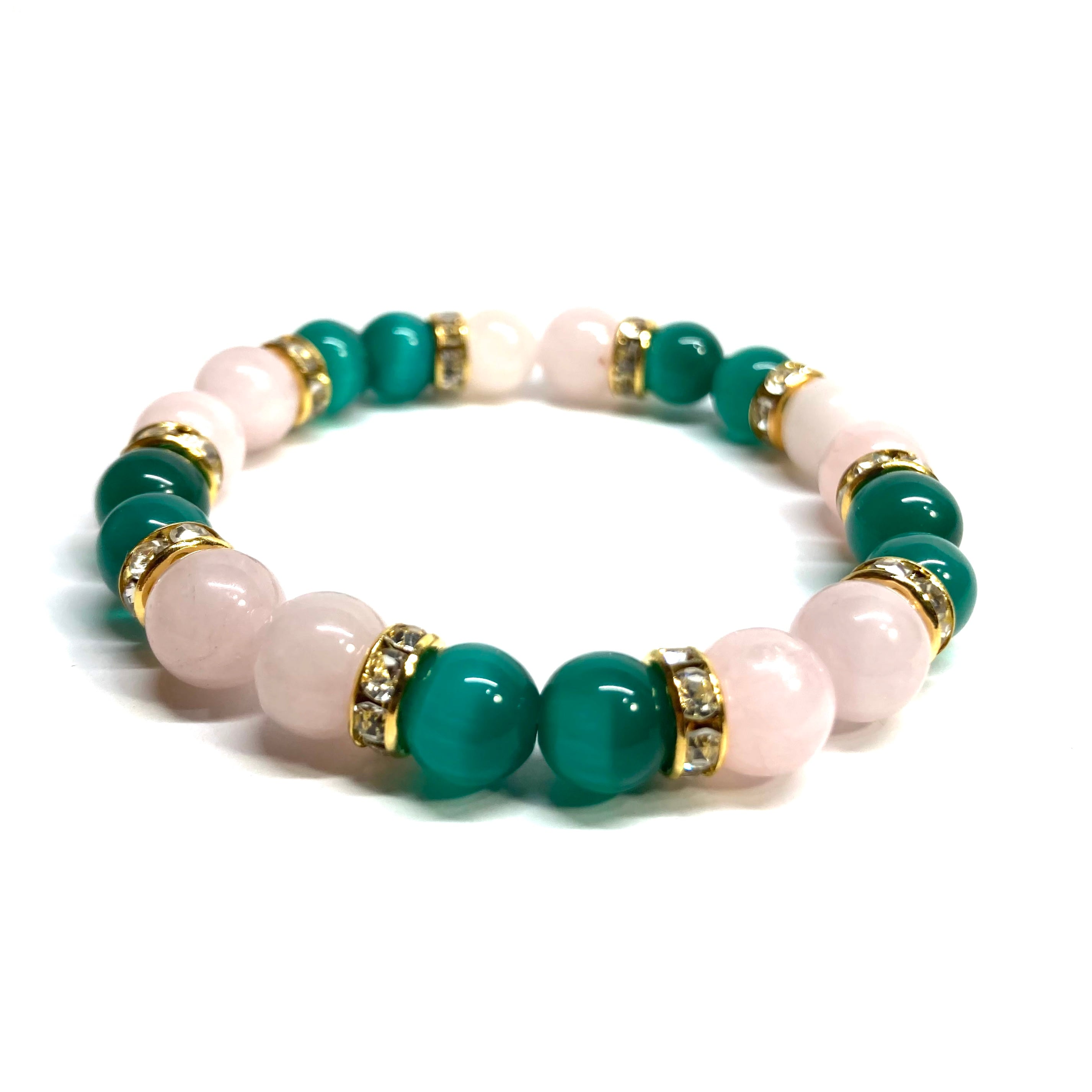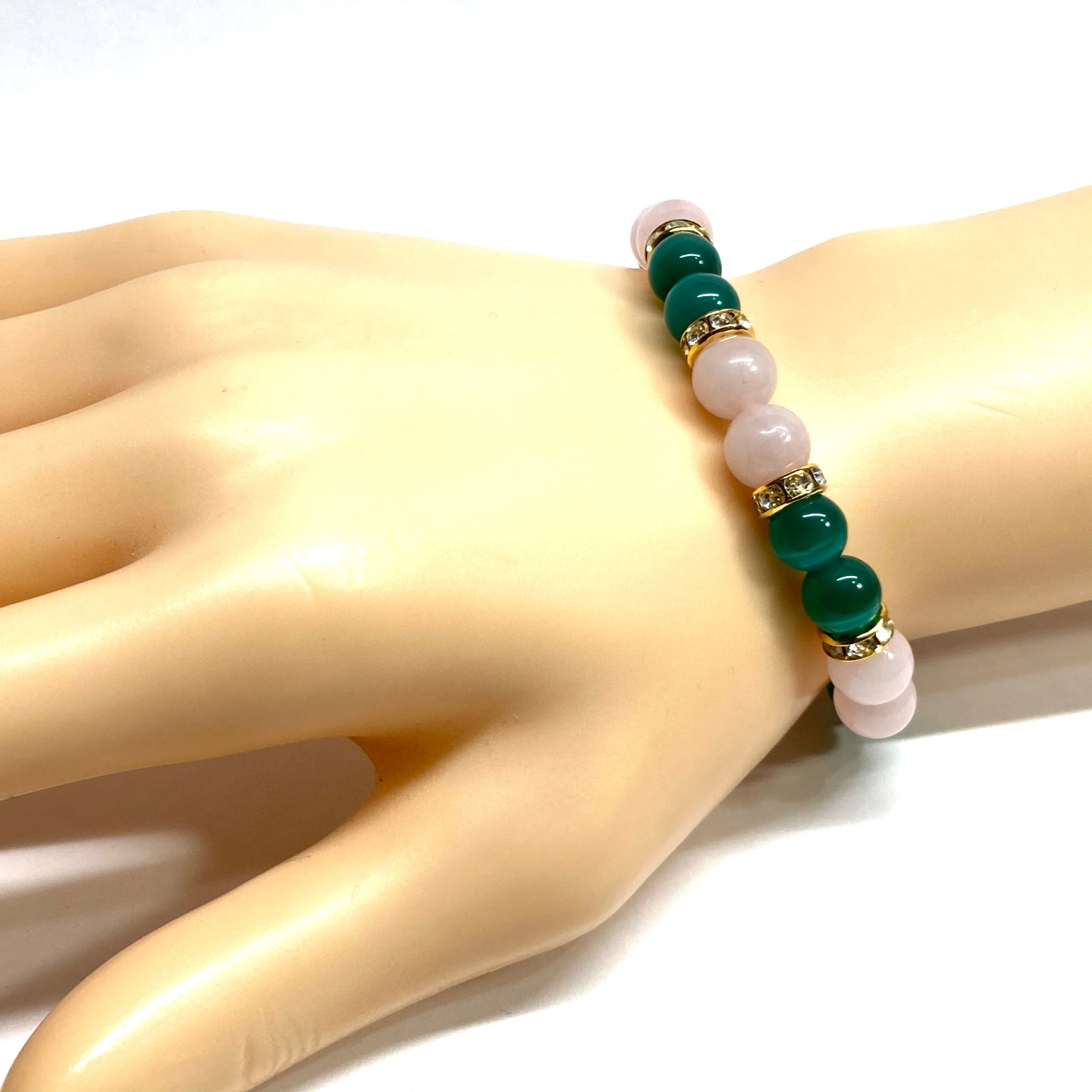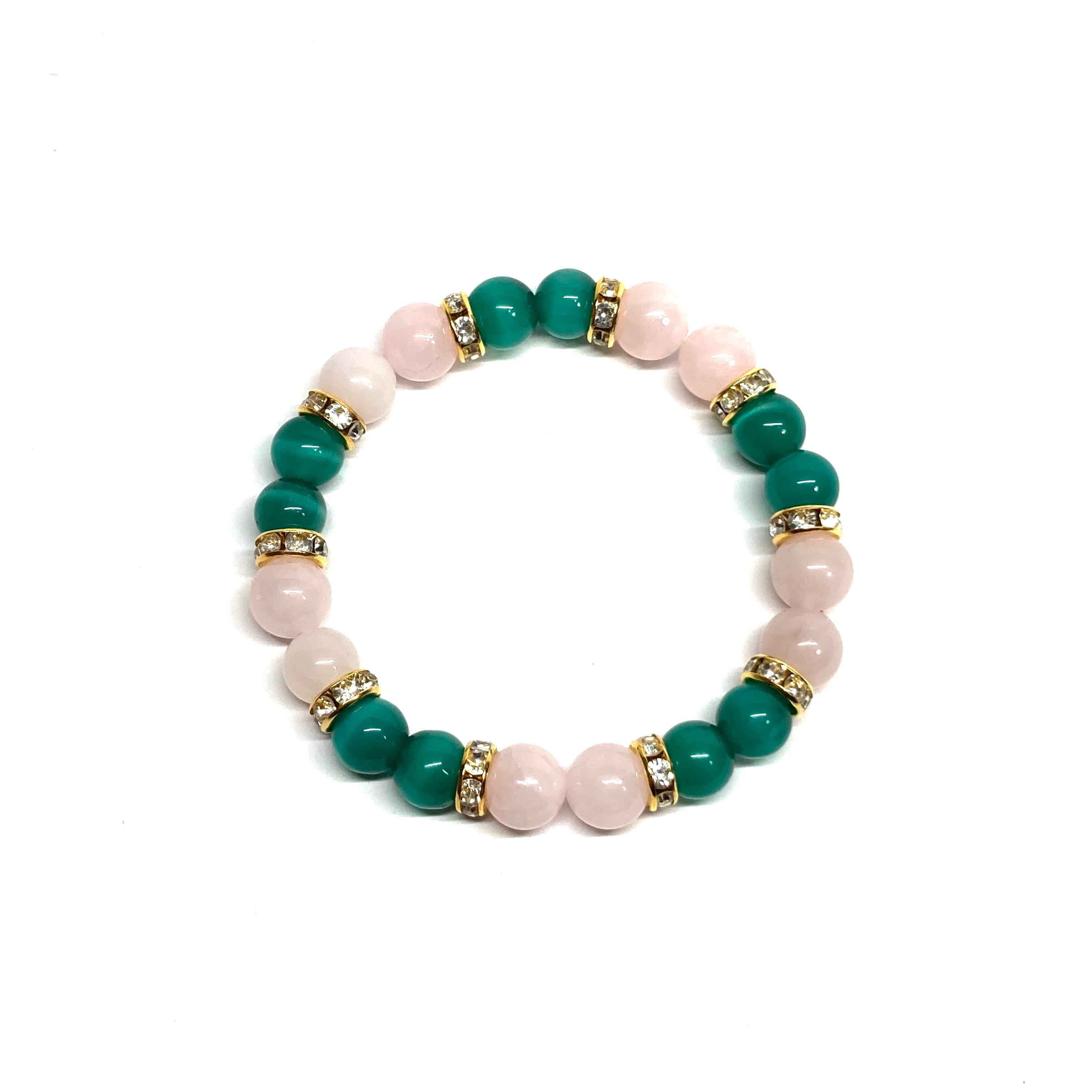 こちらは、8mm玉のグリーンキャッツアイとローズクォーツを使用したパワーストーンブレスレットです。間にはゴールドのロンデルを挟み高級感ある大人っぽいデザインに仕上がっています。サイズは内周約15cmです。気になる方は是非この機会にどうぞ。