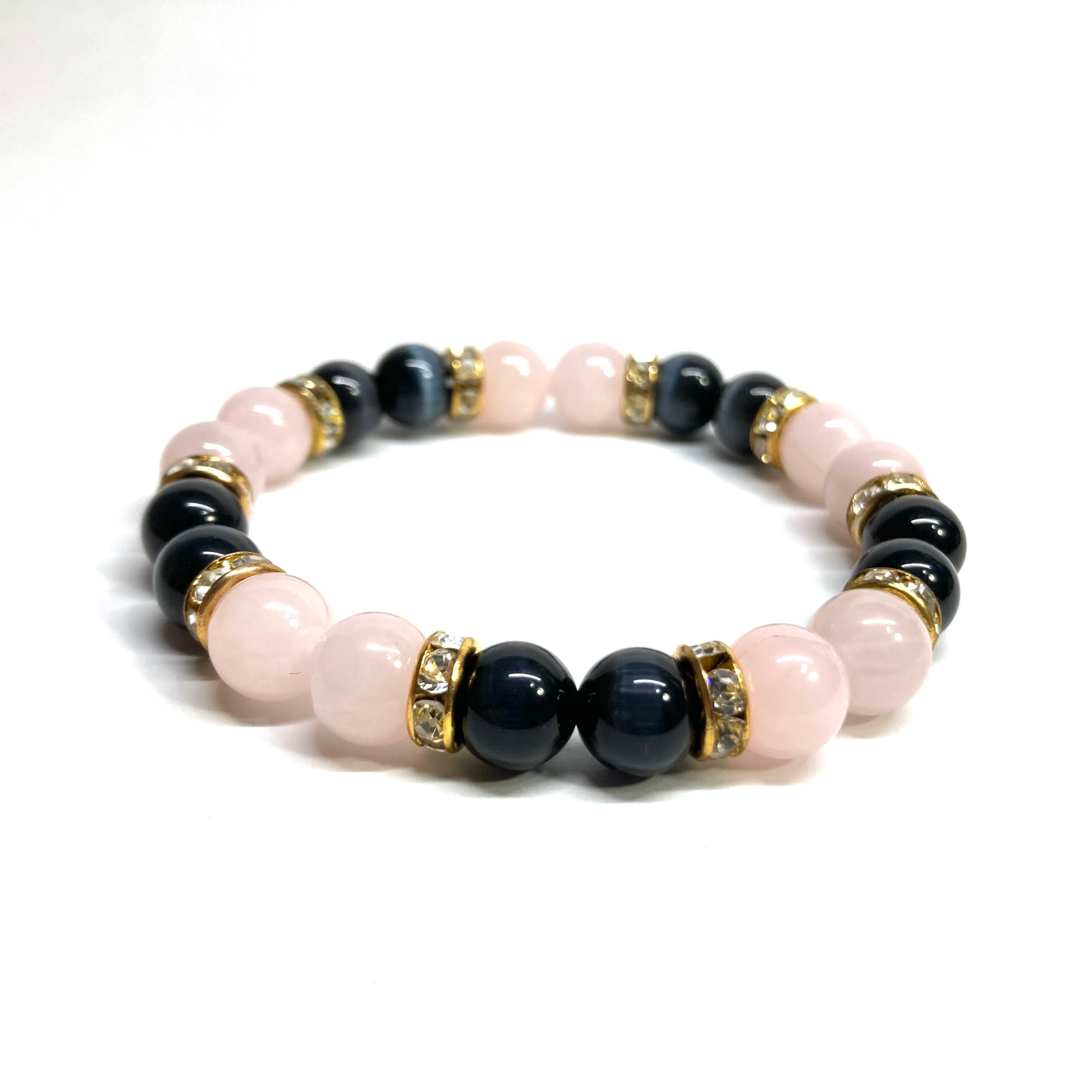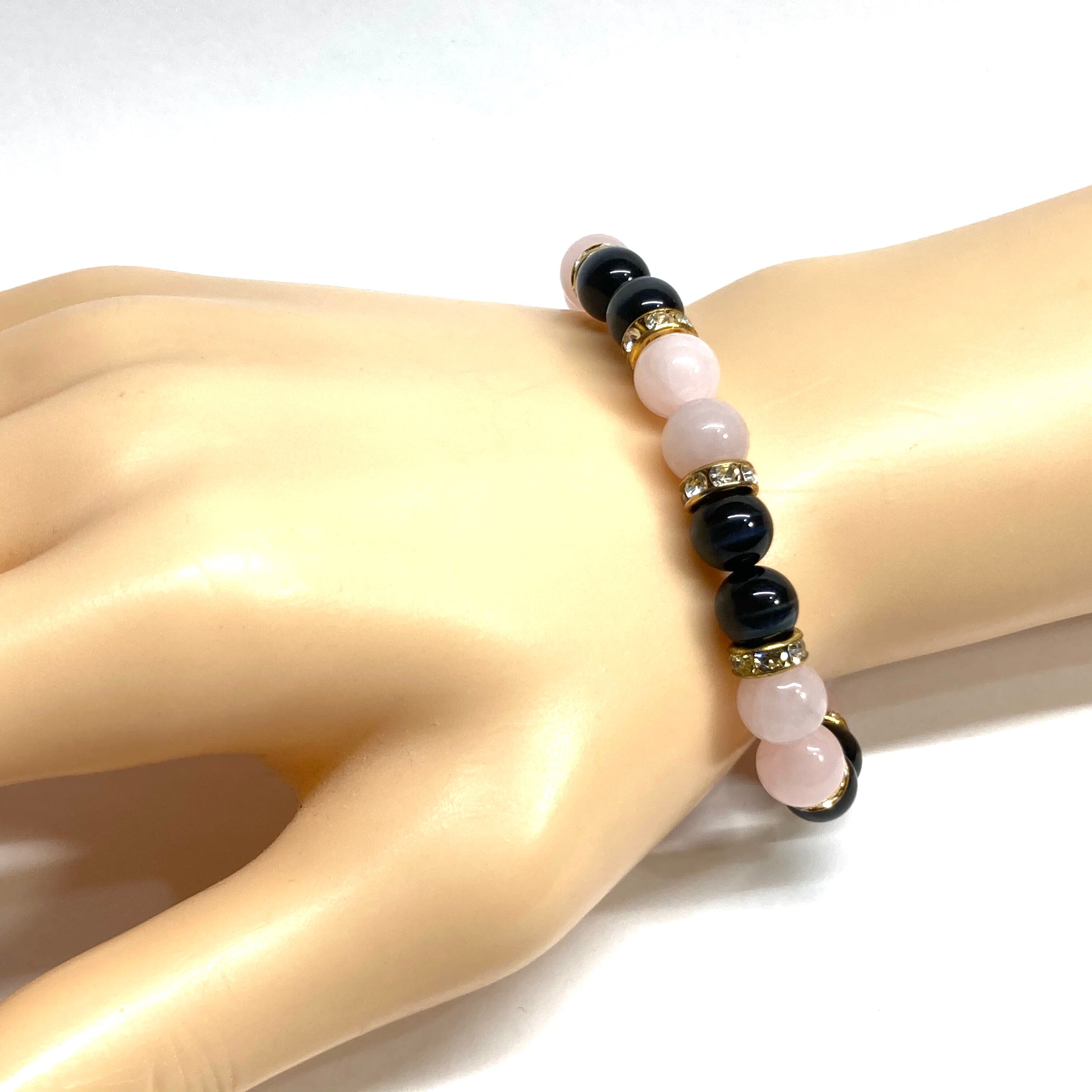こちらは、8mm玉のブラックキャッツアイとローズクォーツを使用したパワーストーンブレスレットです。間にはゴールドのロンデルを挟み高級感ある大人っぽいデザインに仕上がっています。サイズは内周約15cmです。気になる方は是非この機会にどうぞ。
