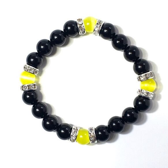 こちらは、8mm玉のイエローキャッツアイとオニキスを使用したパワーストーンブレスレットです。間にはシルバーのロンデルを挟み高級感ある大人っぽいデザインに仕上がっています。サイズは内周 約15cm(手首周りを測り少し余裕をもってお買い求めくださいませ。) です。気になる方は是非この機会にどうぞ。