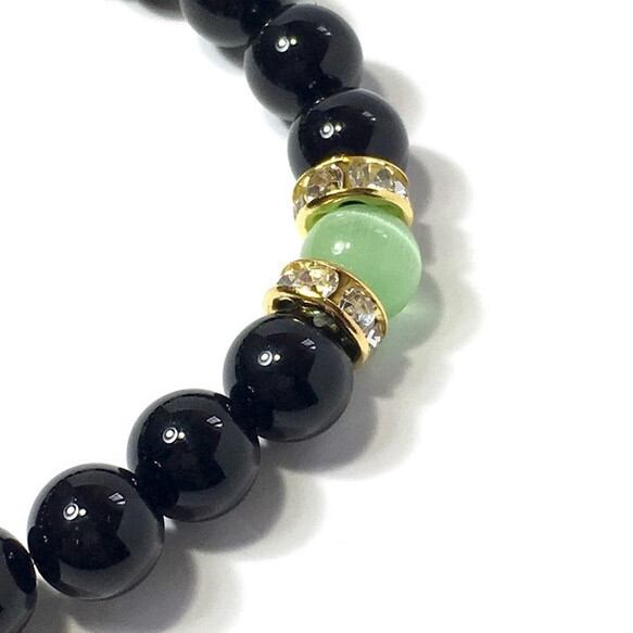 こちらは、8mm玉のライトグリーンキャッツアイとオニキスを使用したパワーストーンブレスレットです。間にはシルバーのロンデルを挟み高級感ある大人っぽいデザインに仕上がっています。サイズは内周 約15cm(手首周りを測り少し余裕をもってお買い求めくださいませ。) です。気になる方は是非この機会にどうぞ。