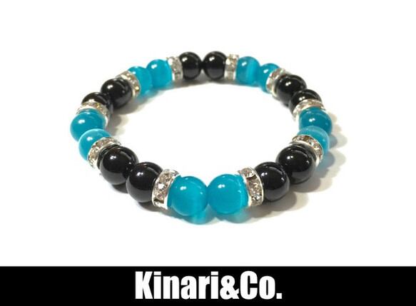 こちらは、8mm玉のライトブルーキャッツアイとオニキスを使用したパワーストーンブレスレットです。間にはシルバーのロンデルを挟み高級感ある大人っぽいデザインに仕上がっています。サイズは内周 約15cm(手首周りを測り少し余裕をもってお買い求めくださいませ。) です。気になる方は是非この機会にどうぞ。