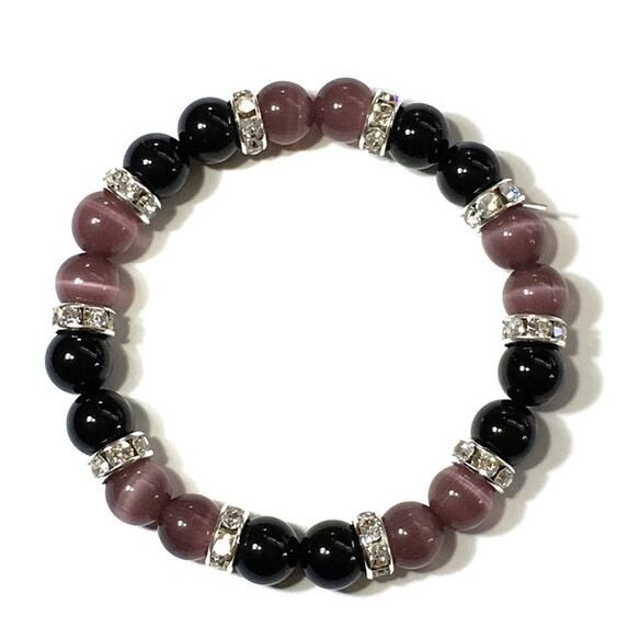 こちらは、8mm玉のパープルキャッツアイとオニキスを使用したパワーストーンブレスレットです。間にはシルバーのロンデルを挟み高級感ある大人っぽいデザインに仕上がっています。サイズは内周 約15cm(手首周りを測り少し余裕をもってお買い求めくださいませ。) です。気になる方は是非この機会にどうぞ。
