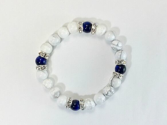 こちらは、8mm玉のブルータイガーアイとハウライトを使用したパワーストーンブレスレットです。間にはロンデルを挟み高級感ある大人っぽいデザインに仕上がっています。内径約15cmです。気になる方は是非この機会にどうぞ。