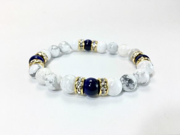 こちらは、8mm玉のブルータイガーアイとハウライトを使用したパワーストーンブレスレットです。間にはロンデルを挟み高級感ある大人っぽいデザインに仕上がっています。内径約15cmです。気になる方は是非この機会にどうぞ。