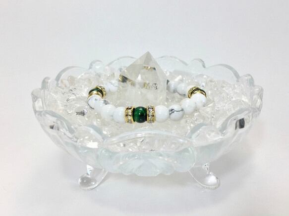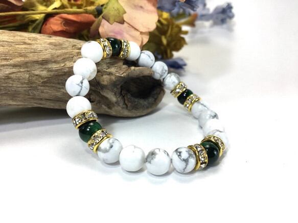 こちらは、8mm玉のグリーンタイガーアイとハウライトを使用したパワーストーンブレスレットです。間にはロンデルを挟み高級感ある大人っぽいデザインに仕上がっています。内径約15cmです。気になる方は是非この機会にどうぞ。