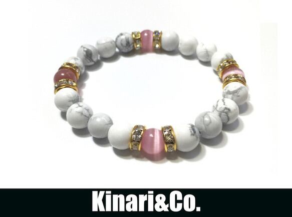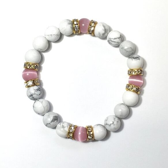 こちらは、8mm玉のピンクキャッツアイとハウライトを使用したパワーストーンブレスレットです。間にはゴールドのロンデルを挟み高級感ある大人っぽいデザインに仕上がっています。サイズは内周約15cmです。気になる方は是非この機会にどうぞ。