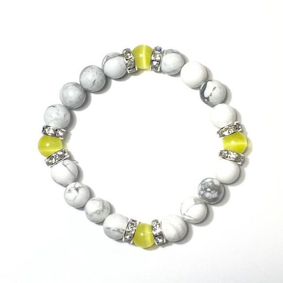 こちらは、8mm玉のイエローキャッツアイとハウライトを使用したパワーストーンブレスレットです。間にはシルバーのロンデルを挟み高級感ある大人っぽいデザインに仕上がっています。サイズは内周約15cmです。気になる方は是非この機会にどうぞ。