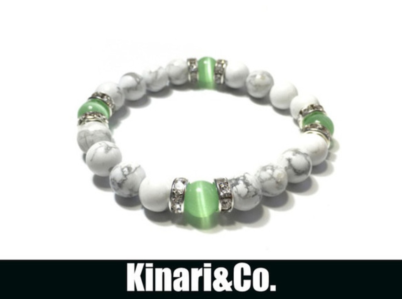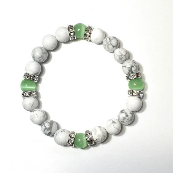 こちらは、8mm玉のライトグリーンキャッツアイとハウライトを使用したパワーストーンブレスレットです。間にはシルバーのロンデルを挟み高級感ある大人っぽいデザインに仕上がっています。サイズは内周約15cmです。気になる方は是非この機会にどうぞ。