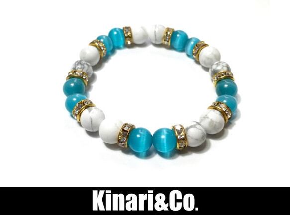 こちらは、8mm玉のライトブルーキャッツアイとハウライトを使用したパワーストーンブレスレットです。間にはゴールドのロンデルを挟み高級感ある大人っぽいデザインに仕上がっています。サイズは内周約15cmです。気になる方は是非この機会にどうぞ。