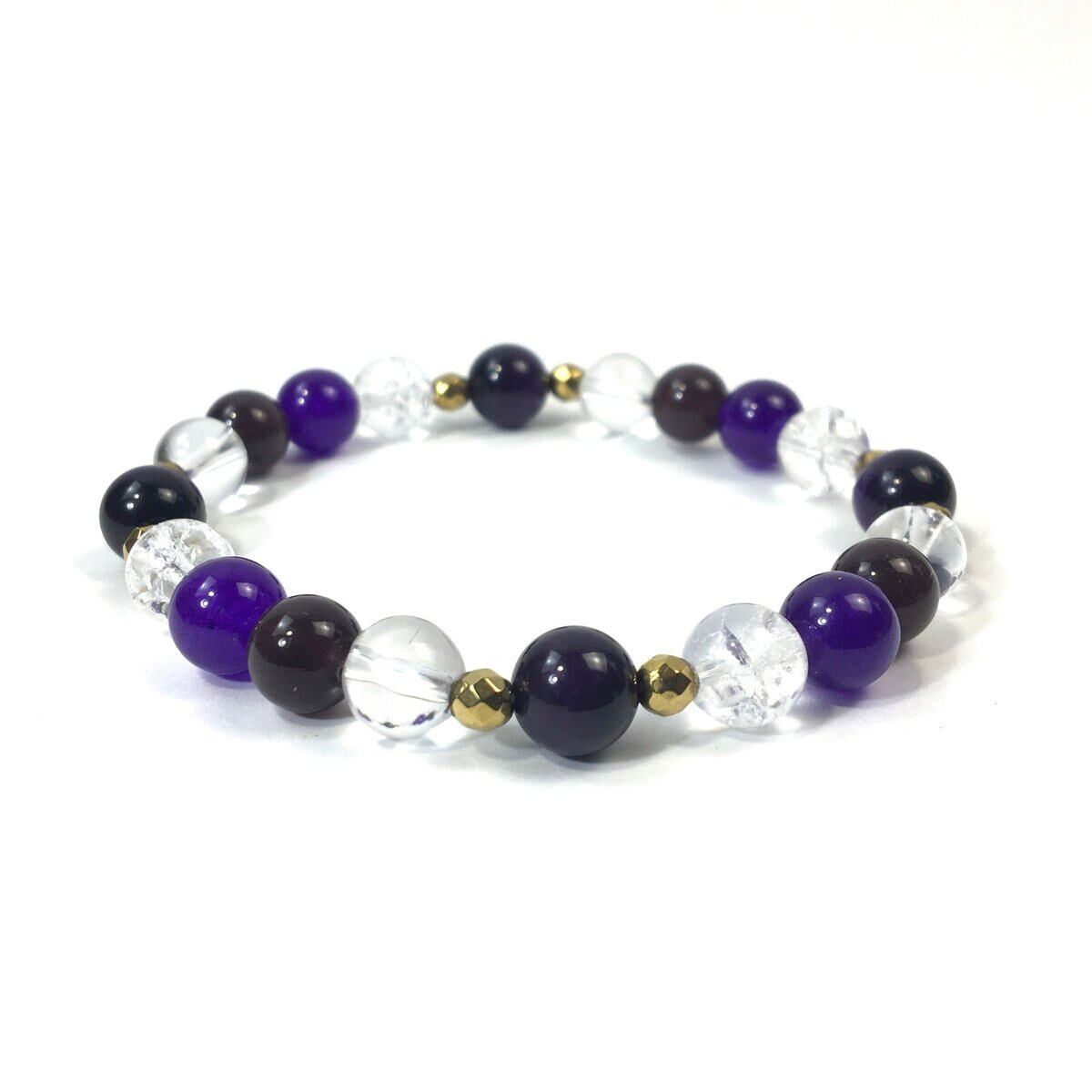 こちらは、8mm玉のパープルタイガーアイ、キャッツアイ、水晶、ジェイド、クラック水晶を使ったパワーストーンブレスレットです。今回は石との間にはゴールドのヘマタイトを加えアクセントとしております。今回は5種の石を使い可愛らしいデザインに仕上げています。サイズは内周 約16cm(手首周りを測り少し余裕をもってお買い求めくださいませ) 気になる方は是非この機会にどうぞ。