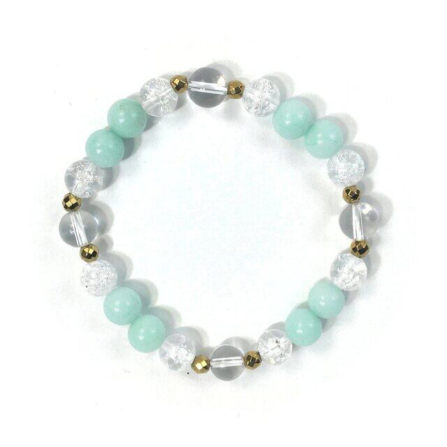 こちらは、8mm玉の水晶とクラック水晶、ジェイドを使ったパワーストーンブレスレットです。今回は石との間にはゴールドのヘマタイトを加えアクセントとしております。今回は3種の石を使い可愛らしいデザインに仕上げています。サイズは内周 約16cm(手首周りを測り少し余裕をもってお買い求めくださいませ) 気になる方は是非この機会にどうぞ。