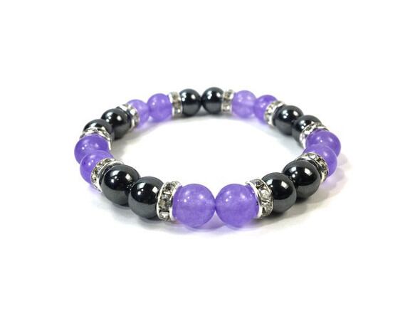 こちらは、8mm玉のジェイド(ラベンダーパープル)とヘマタイトを使用したパワーストーンブレスレットです。間にはロンデルを挟み高級感ある大人っぽいデザインに仕上がっています。サイズは内周約15cmです。気になる方は是非この機会にどうぞ。
