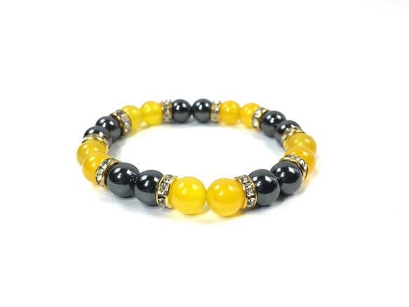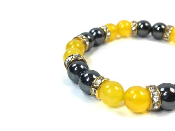 こちらは、8mm玉のジェイド(イエロー)とヘマタイトを使用したパワーストーンブレスレットです。間にはロンデルを挟み高級感ある大人っぽいデザインに仕上がっています。サイズは内周約15cmです。気になる方は是非この機会にどうぞ。