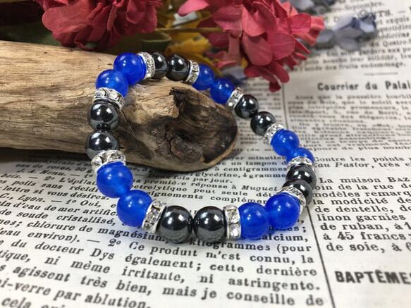 こちらは、8mm玉のジェイド(ブルー)とヘマタイトを使用したパワーストーンブレスレットです。間にはロンデルを挟み高級感ある大人っぽいデザインに仕上がっています。サイズは内周約15cmです。気になる方は是非この機会にどうぞ。