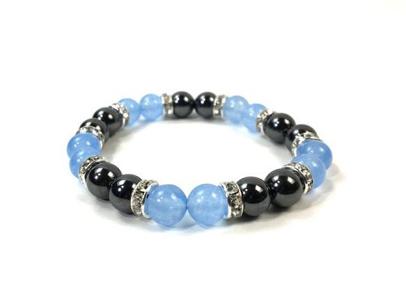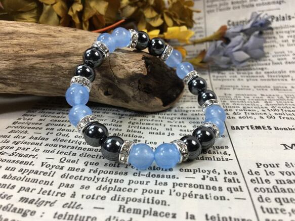 こちらは、8mm玉のジェイド(シーブルー)とヘマタイトを使用したパワーストーンブレスレットです。間にはロンデルを挟み高級感ある大人っぽいデザインに仕上がっています。サイズは内周約15cmです。気になる方は是非この機会にどうぞ。