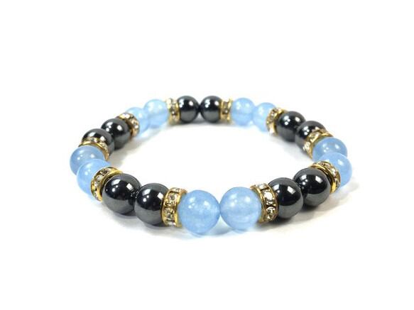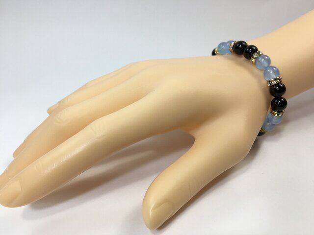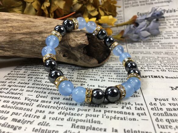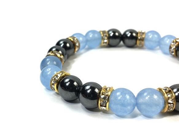 こちらは、8mm玉のジェイド(シーブルー)とヘマタイトを使用したパワーストーンブレスレットです。間にはロンデルを挟み高級感ある大人っぽいデザインに仕上がっています。サイズは内周約15cmです。気になる方は是非この機会にどうぞ。