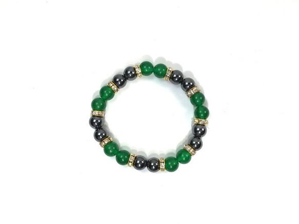 こちらは、8mm玉のジェイド(グリーン)とヘマタイトを使用したパワーストーンブレスレットです。間にはロンデルを挟み高級感ある大人っぽいデザインに仕上がっています。サイズは内周約15cmです。気になる方は是非この機会にどうぞ。