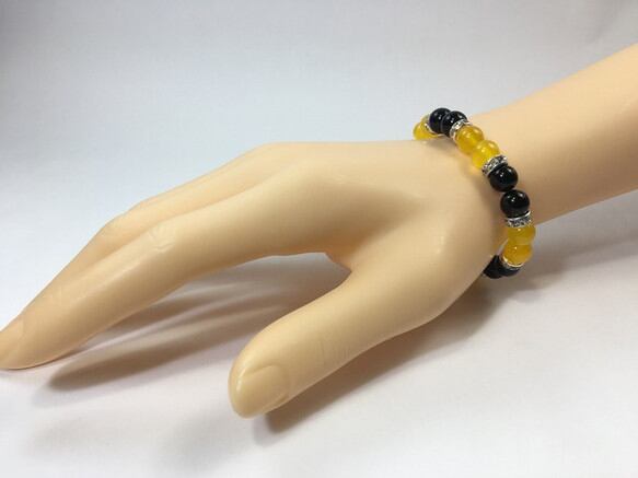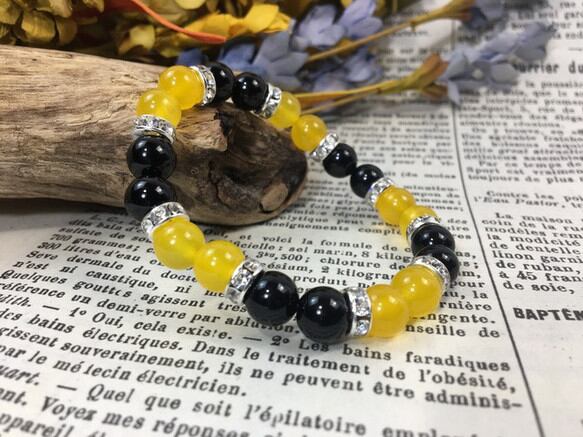 こちらは、8mm玉のジェイド(イエロー)とオニキスを使用したパワーストーンブレスレットです。間にはロンデルを挟み高級感ある大人っぽいデザインに仕上がっています。サイズは内周約15cmです。気になる方は是非この機会にどうぞ。