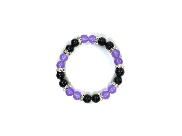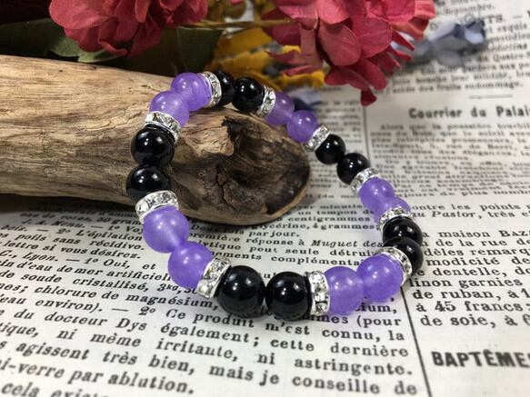 こちらは、8mm玉のジェイド(ラベンダーパープル)とオニキスを使用したパワーストーンブレスレットです。間にはロンデルを挟み高級感ある大人っぽいデザインに仕上がっています。サイズは内周約15cmです。気になる方は是非この機会にどうぞ。