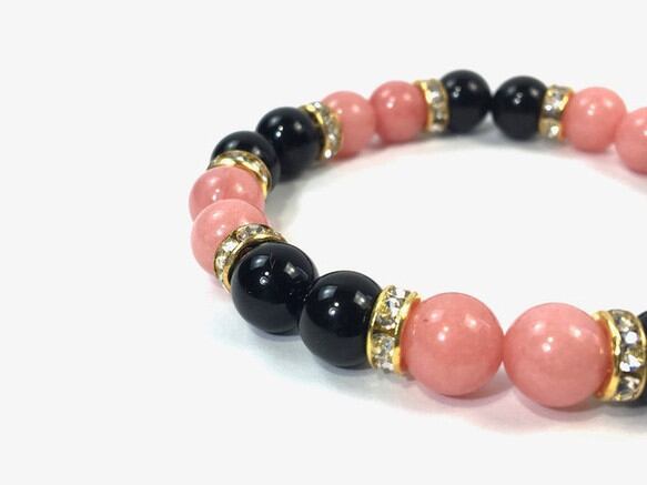 こちらは、8mm玉のジェイド(ピンク)とオニキスを使用したパワーストーンブレスレットです。間にはロンデルを挟み高級感ある大人っぽいデザインに仕上がっています。サイズは内周約15cmです。気になる方は是非この機会にどうぞ。