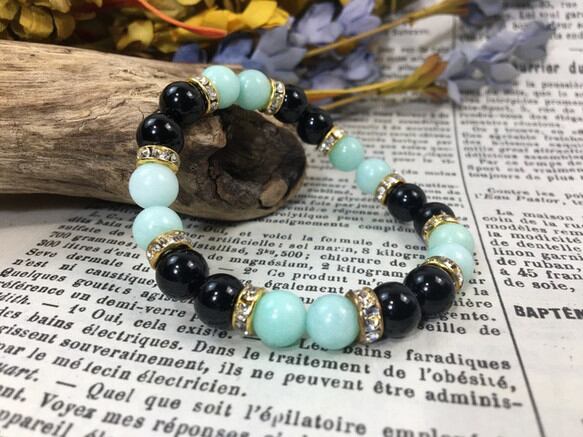 こちらは、8mm玉のジェイド(ブルーグリーン)とオニキスを使用したパワーストーンブレスレットです。間にはロンデルを挟み高級感ある大人っぽいデザインに仕上がっています。サイズは内周約15cmです。気になる方は是非この機会にどうぞ。