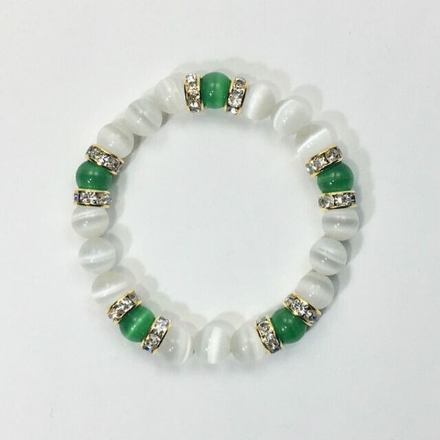 こちらは、8mm玉のグリーンキャッツアイとホワイトキャッツアイを組み合わせたパワーストーンブレスレットです。今回は五芒星デザインで石を配置しております。五芒星とは、陰陽道の基本概念となった陰陽五行説、木・火・土・金・水の5つの元素の働きの相克を表したものであり、五芒星は厄除・開運を願うデザインと重宝されているデザインです。サイズは内周約14cmです。気になる方は是非この機会にどうぞ。