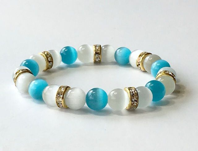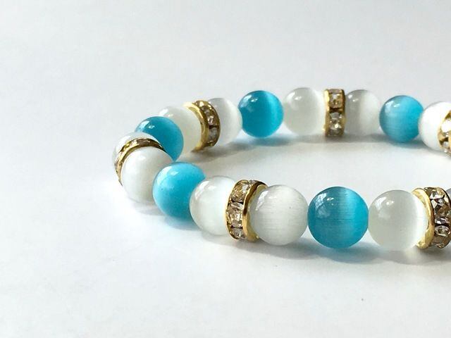 こちらは、8mm玉のライトブルーキャッツアイとホワイトキャッツアイを使用したパワーストーンブレスレットです。間にはゴールドのロンデルを挟み高級感ある大人っぽいデザインに仕上がっています。内周約14cmです。気になる方は是非この機会にどうぞ。