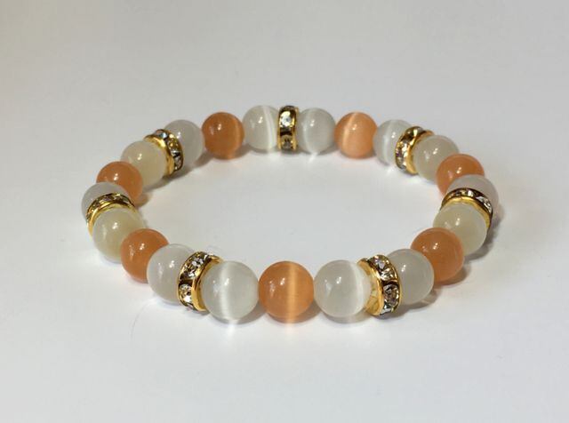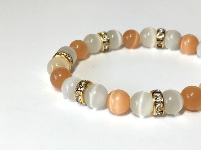 こちらは、8mm玉のオレンジキャッツアイとホワイトキャッツアイを使用したパワーストーンブレスレットです。間にはゴールドのロンデルを挟み高級感ある大人っぽいデザインに仕上がっています。内周約14cmです。気になる方は是非この機会にどうぞ。
