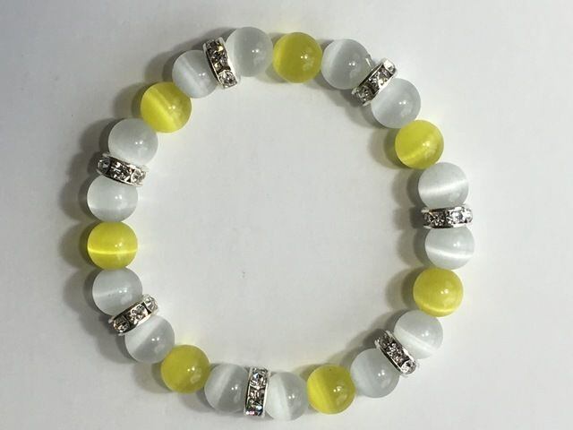 こちらは、8mm玉のイエローキャッツアイとホワイトキャッツアイを使用したパワーストーンブレスレットです。間にはシルバーのロンデルを挟み高級感ある大人っぽいデザインに仕上がっています。内周約14cmです。気になる方は是非この機会にどうぞ。