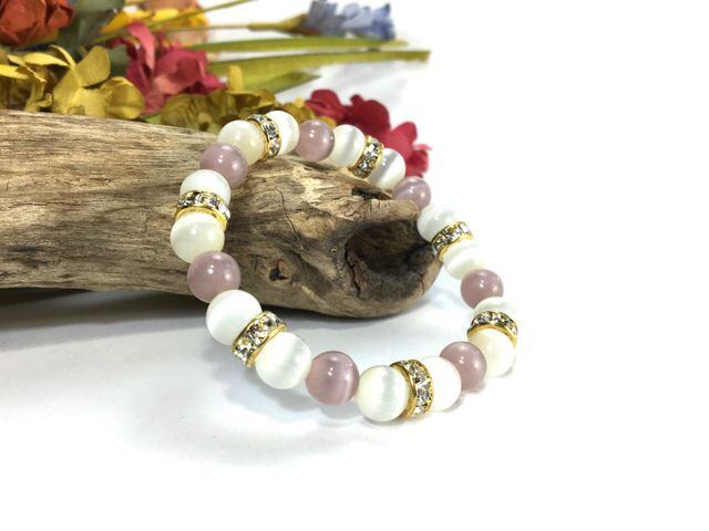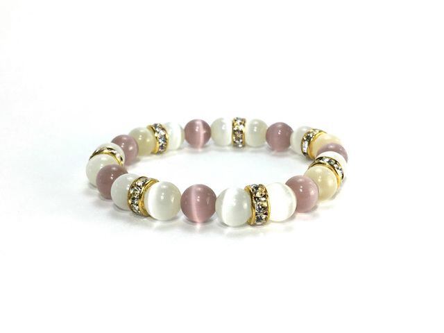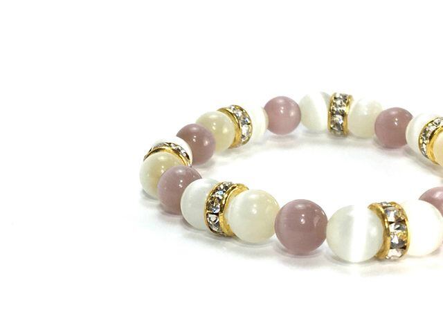 こちらは、8mm玉のライトパープルキャッツアイとホワイトキャッツアイを使用したパワーストーンブレスレットです。間にはゴールドのロンデルを挟み高級感ある大人っぽいデザインに仕上がっています。内周約14cmです。気になる方は是非この機会にどうぞ。