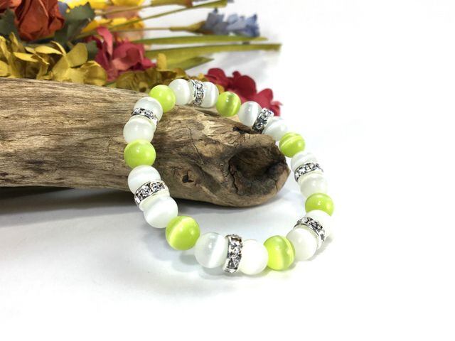 こちらは、8mm玉のライムグリーンキャッツアイとホワイトキャッツアイを使用したパワーストーンブレスレットです。間にはシルバーのロンデルを挟み高級感ある大人っぽいデザインに仕上がっています。内周約14cmです。気になる方は是非この機会にどうぞ。